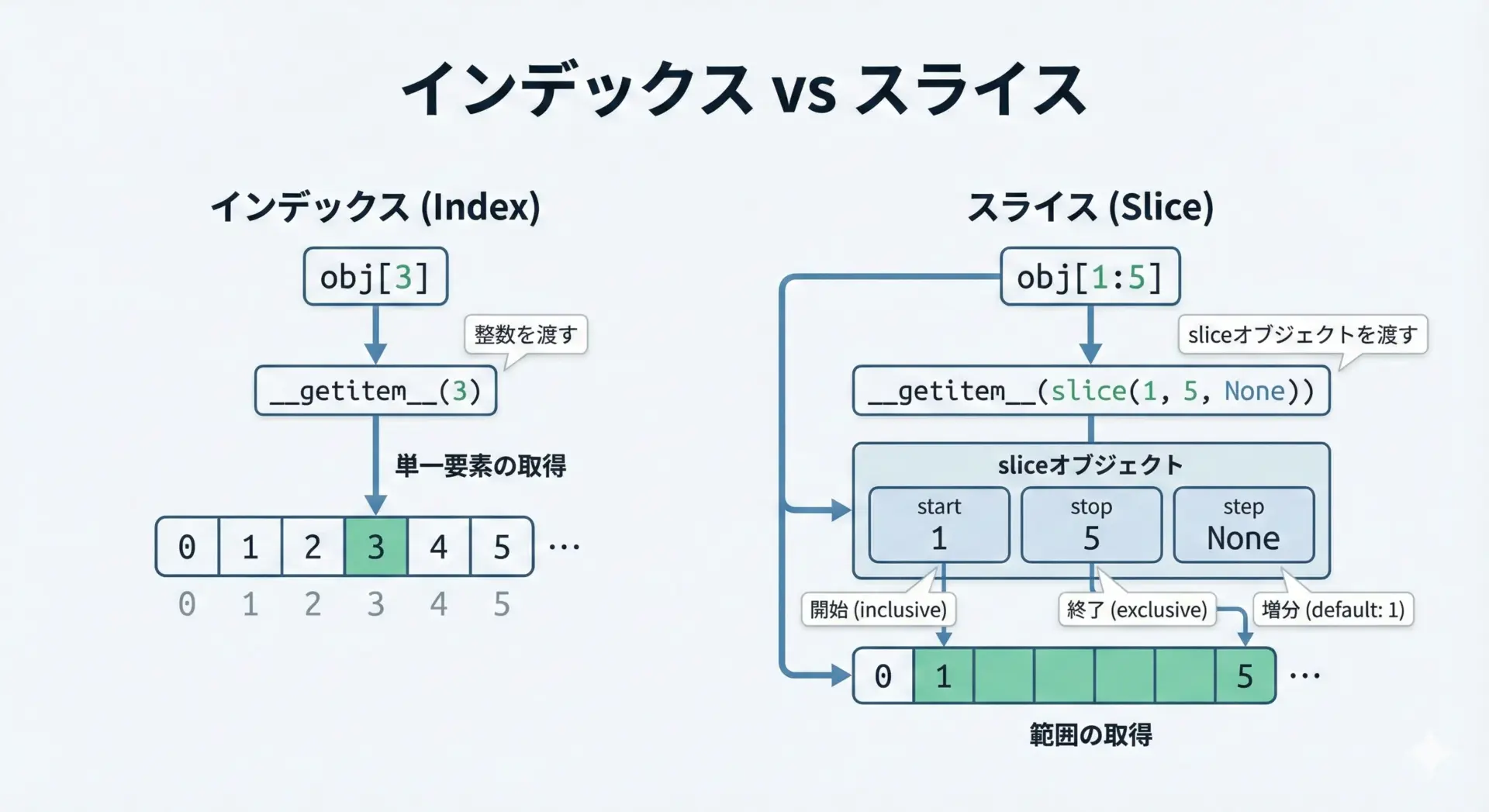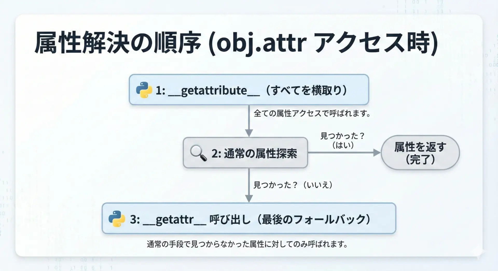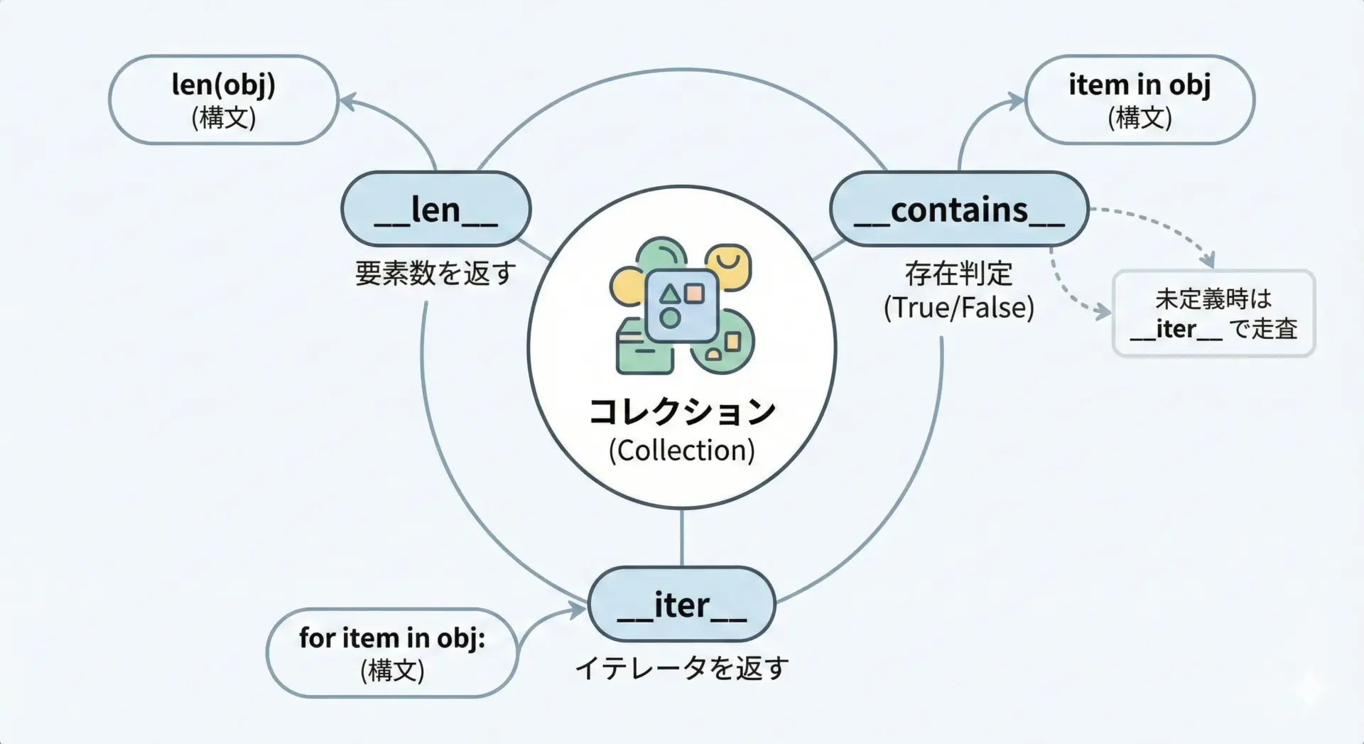 設計時に「ここはlenで長さを取りたい」「ここはwithで安全に扱いたい」と感じたら、その裏にある特殊メソッドを思い出し、必要なフックを実装していくとよいです。