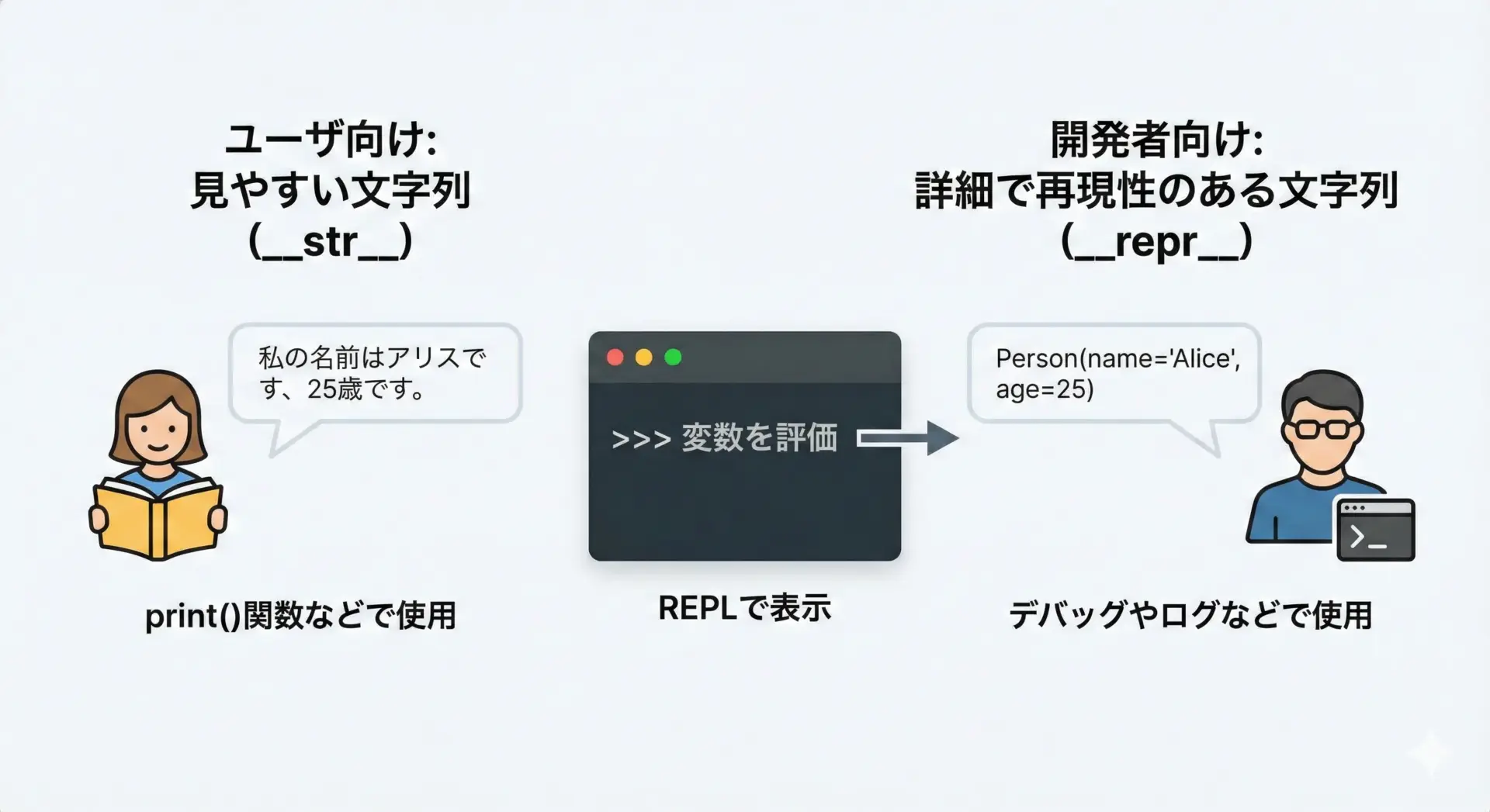 開発者向けの詳細な表現で、可能ならeval(repr(obj)) == objが成り立つように記述するのが理想とされています。REPLで変数を評価したときやrepr(obj)で使われます。