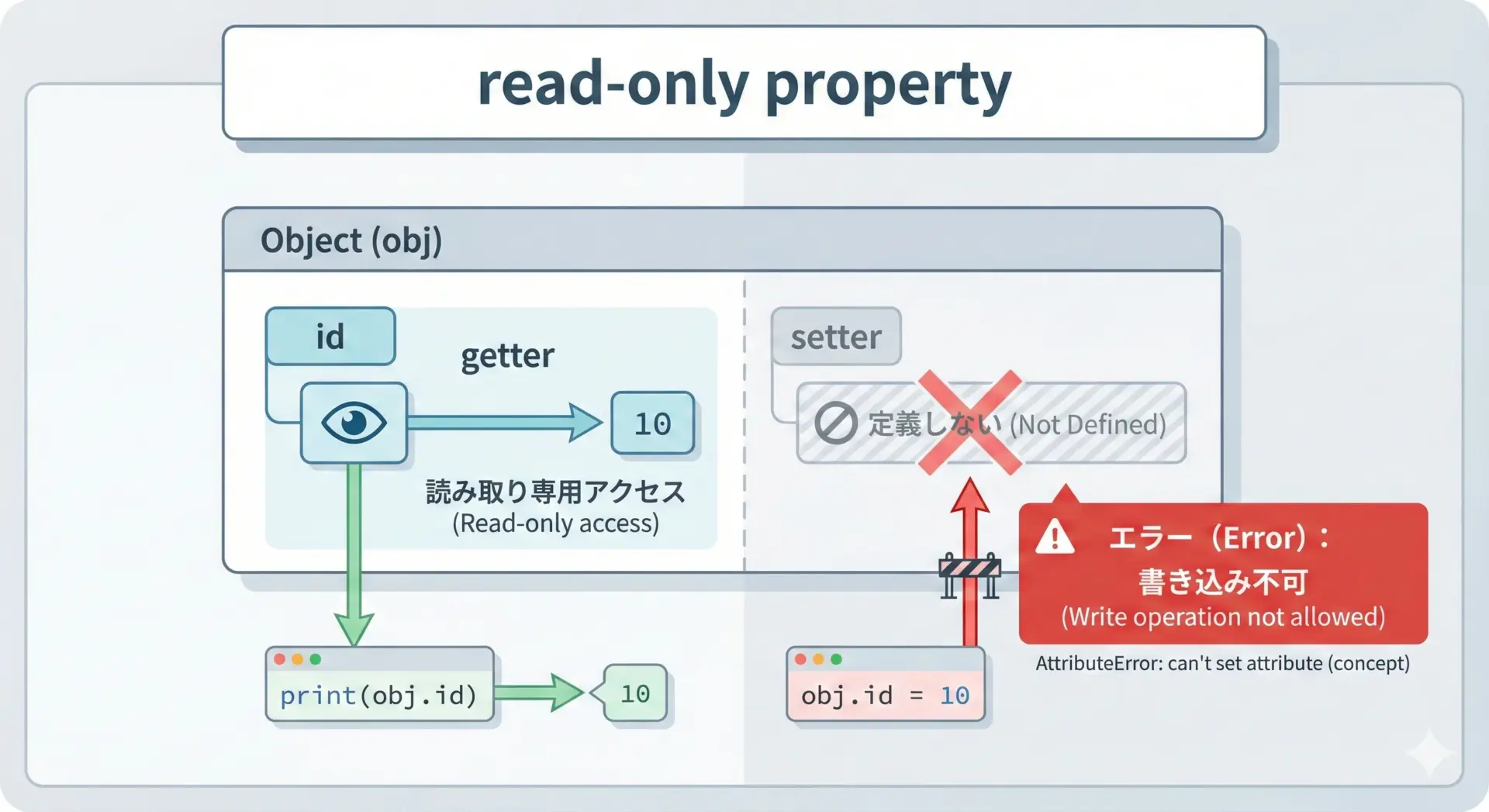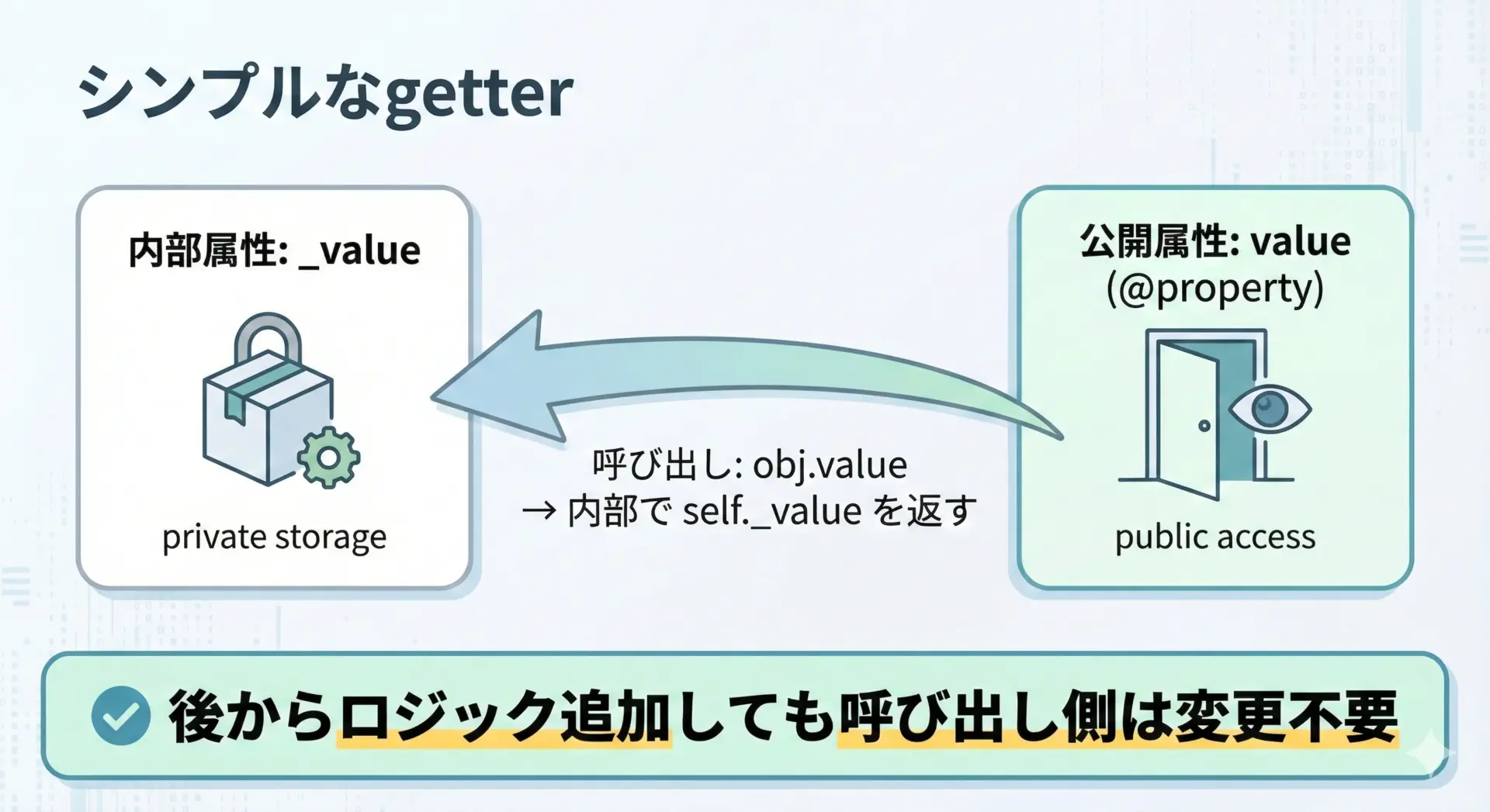 一度propertyとして公開してしまえば、インターフェースはobj.attrのまま、中身のロジックだけを差し替えられる点が大きなメリットです。
