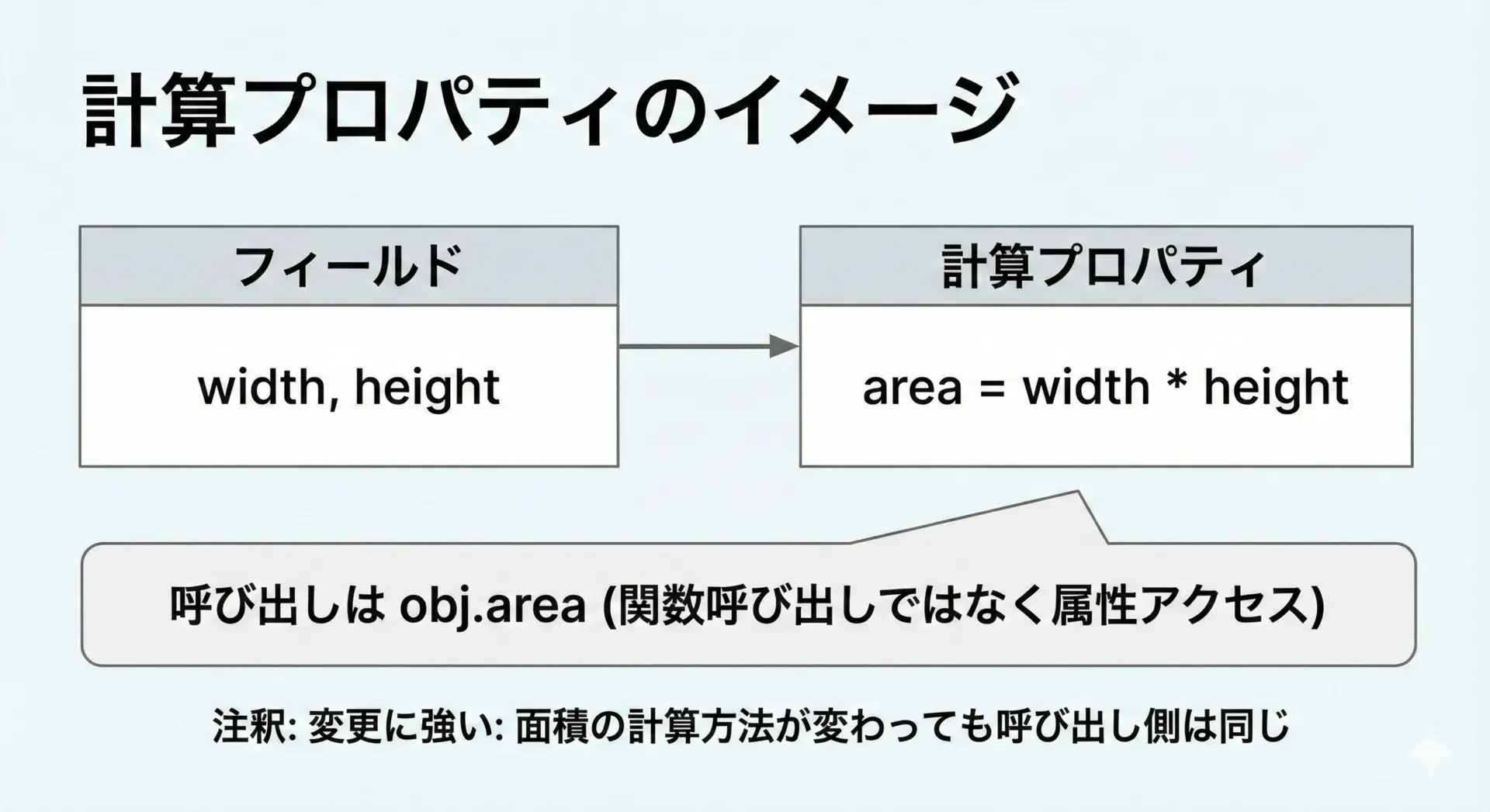 面積を関数rect.area()でなくrect.areaと書けることで、「値っぽさ」が明確になり、読みやすさが向上します。