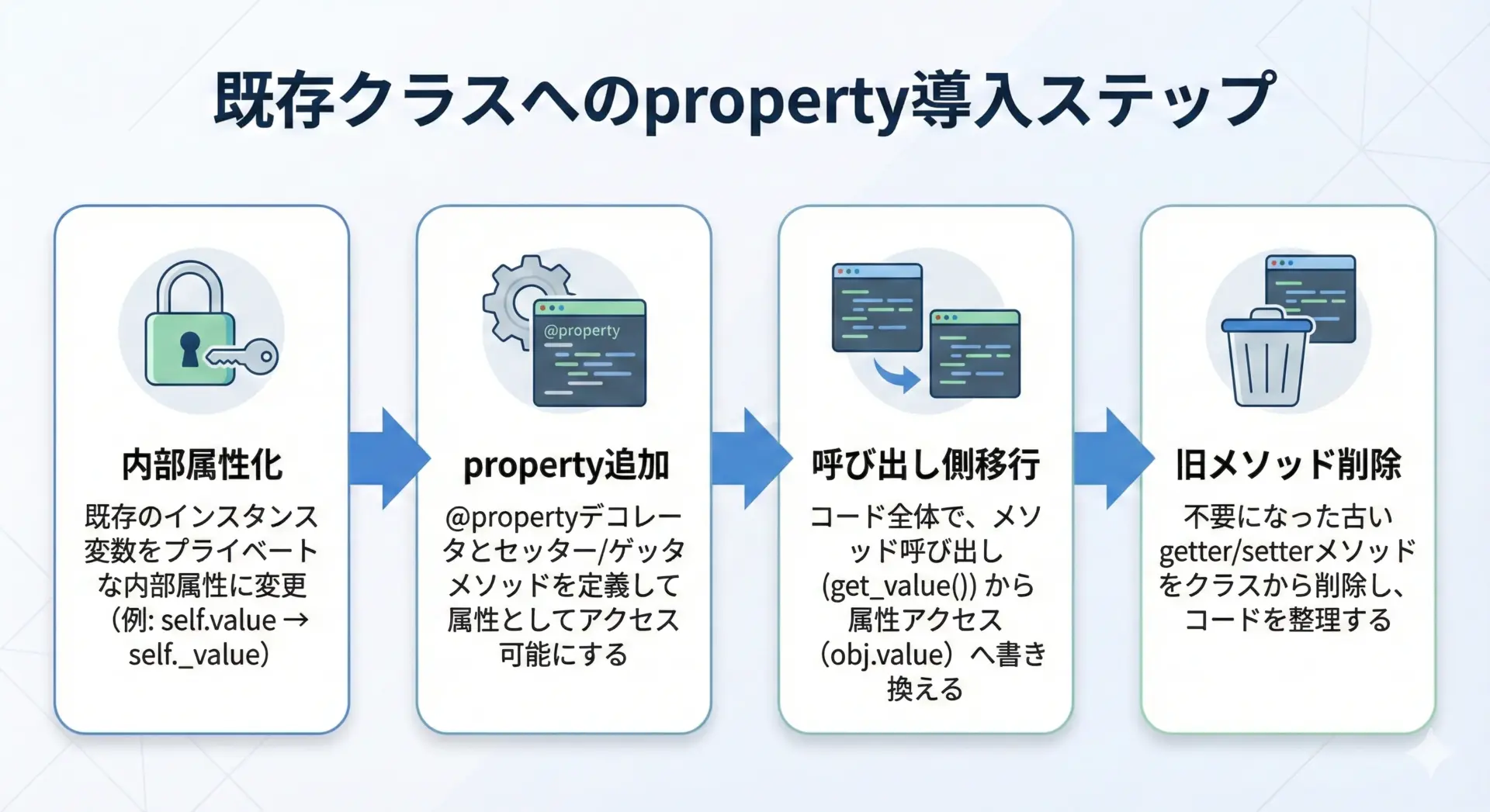 既存コードベースにpropertyを導入する際は、小さなステップで進めると安全です。