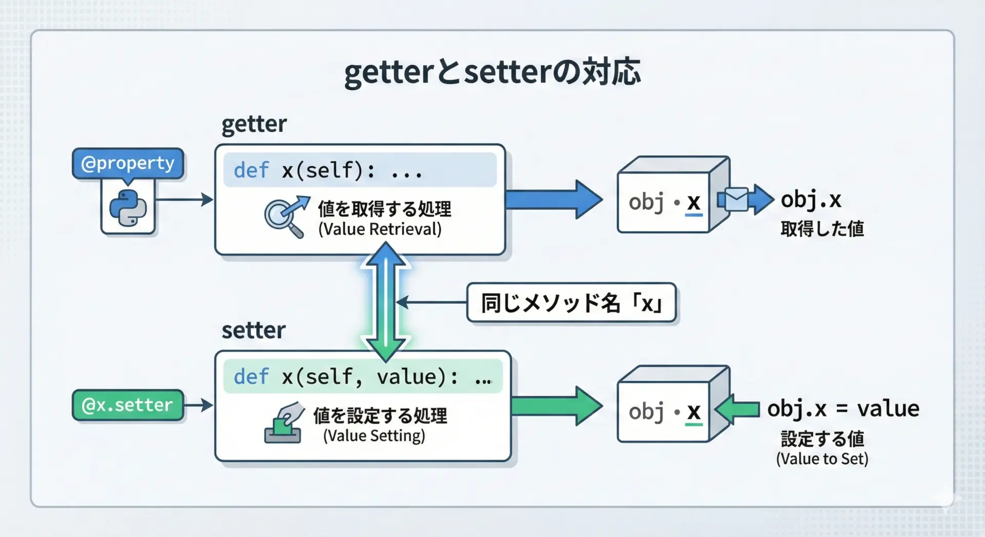 | Python + property | obj.x | obj.x = v | 見た目は属性、裏で関数ロジックが動きます |