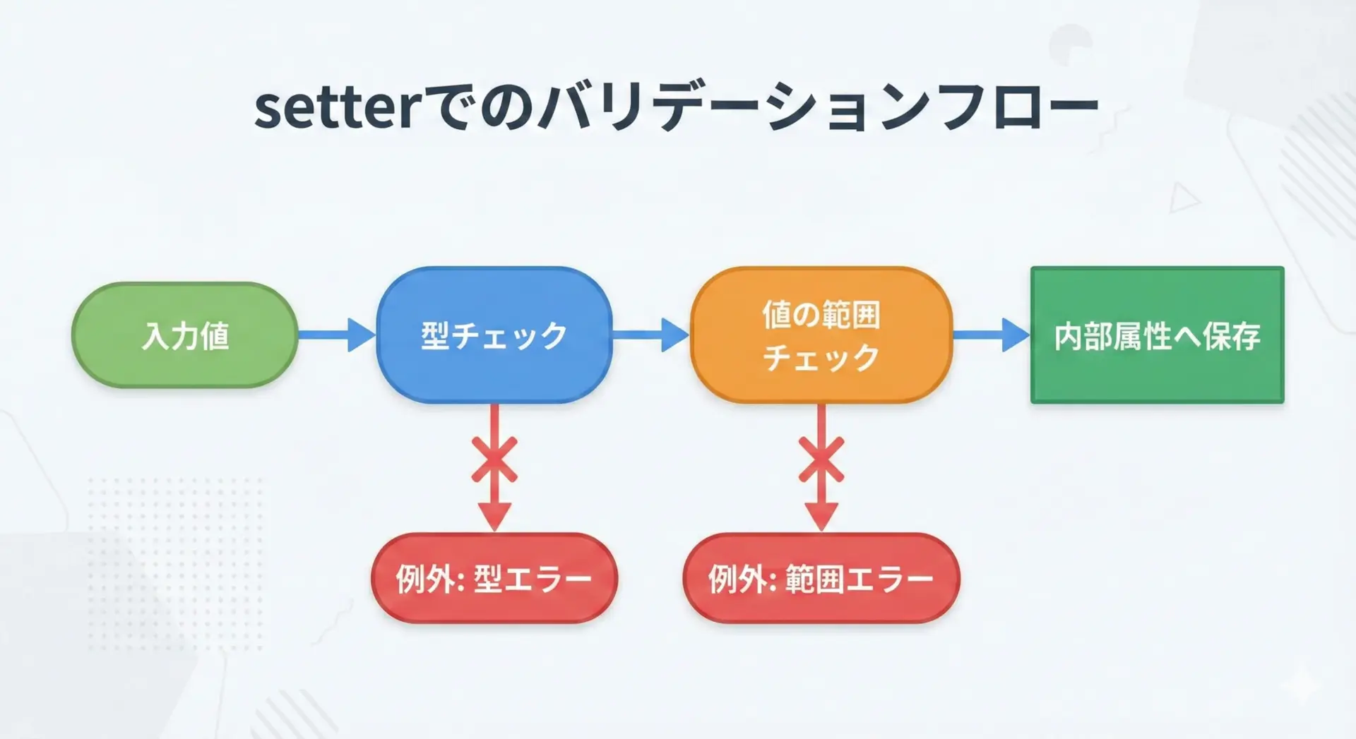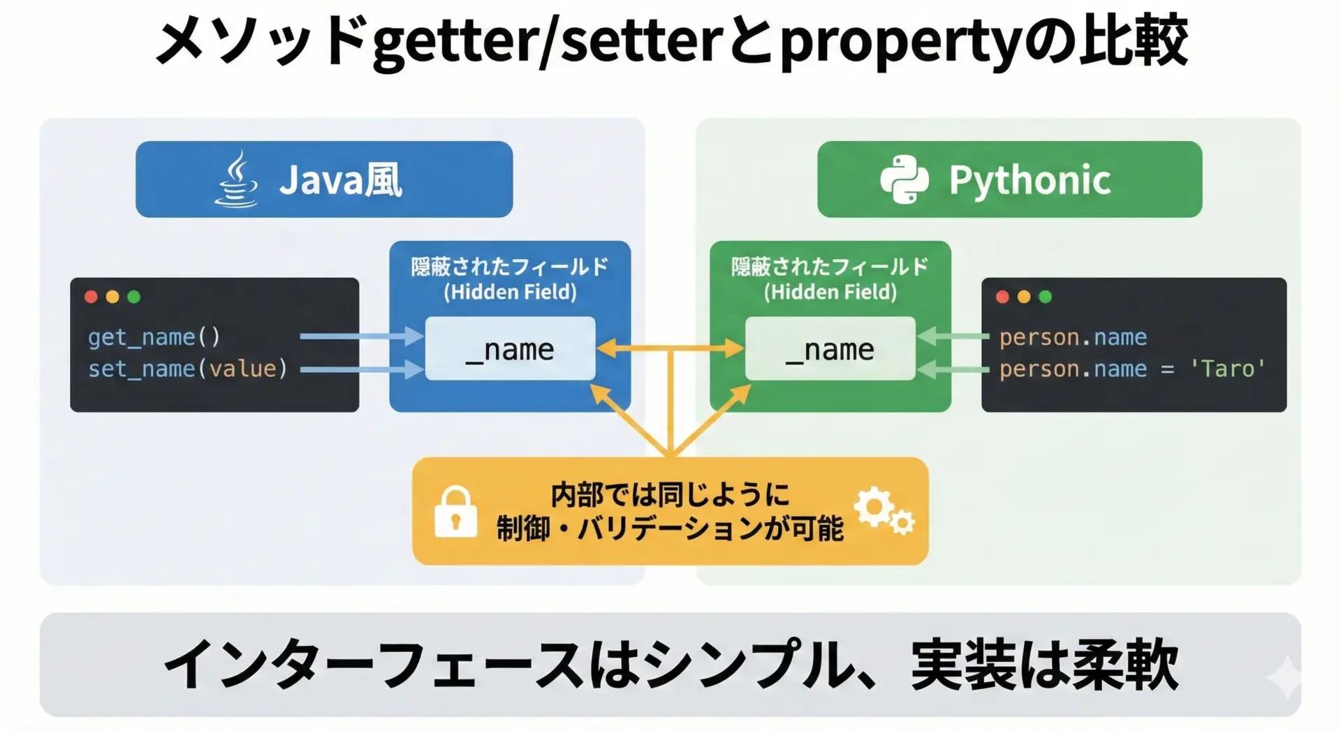 Pythonでは@propertyを使うことで、見た目は単なる属性アクセスのまま、裏側で柔軟な制御やバリデーションを行うことができます。