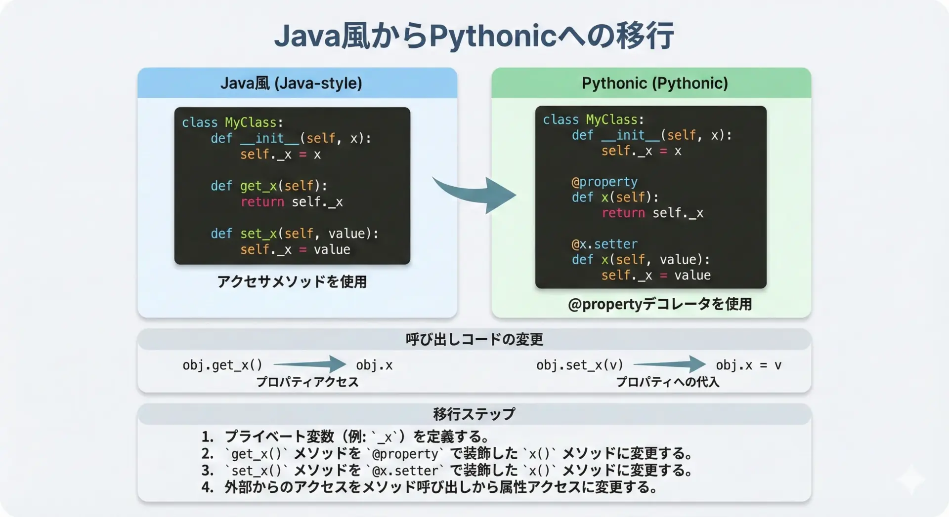 既存クラスも段階的にpropertyへ移行できますので、Java風のgetter/setterから卒業し、Pythonicで保守性の高いインターフェース設計へシフトしていく足がかりとして活用してみてください。