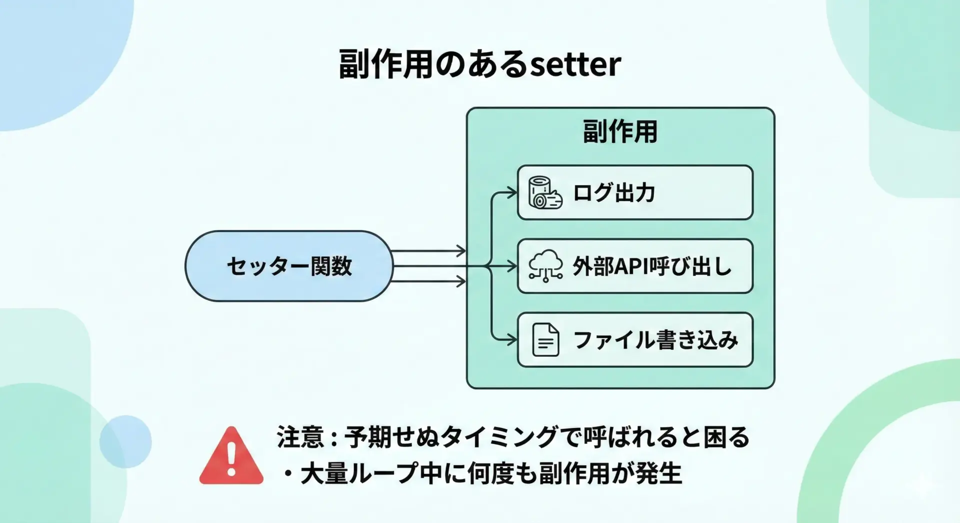 - どうしてもproperty内で副作用を行う場合は、ドキュメントやdocstringでしっかり明記する