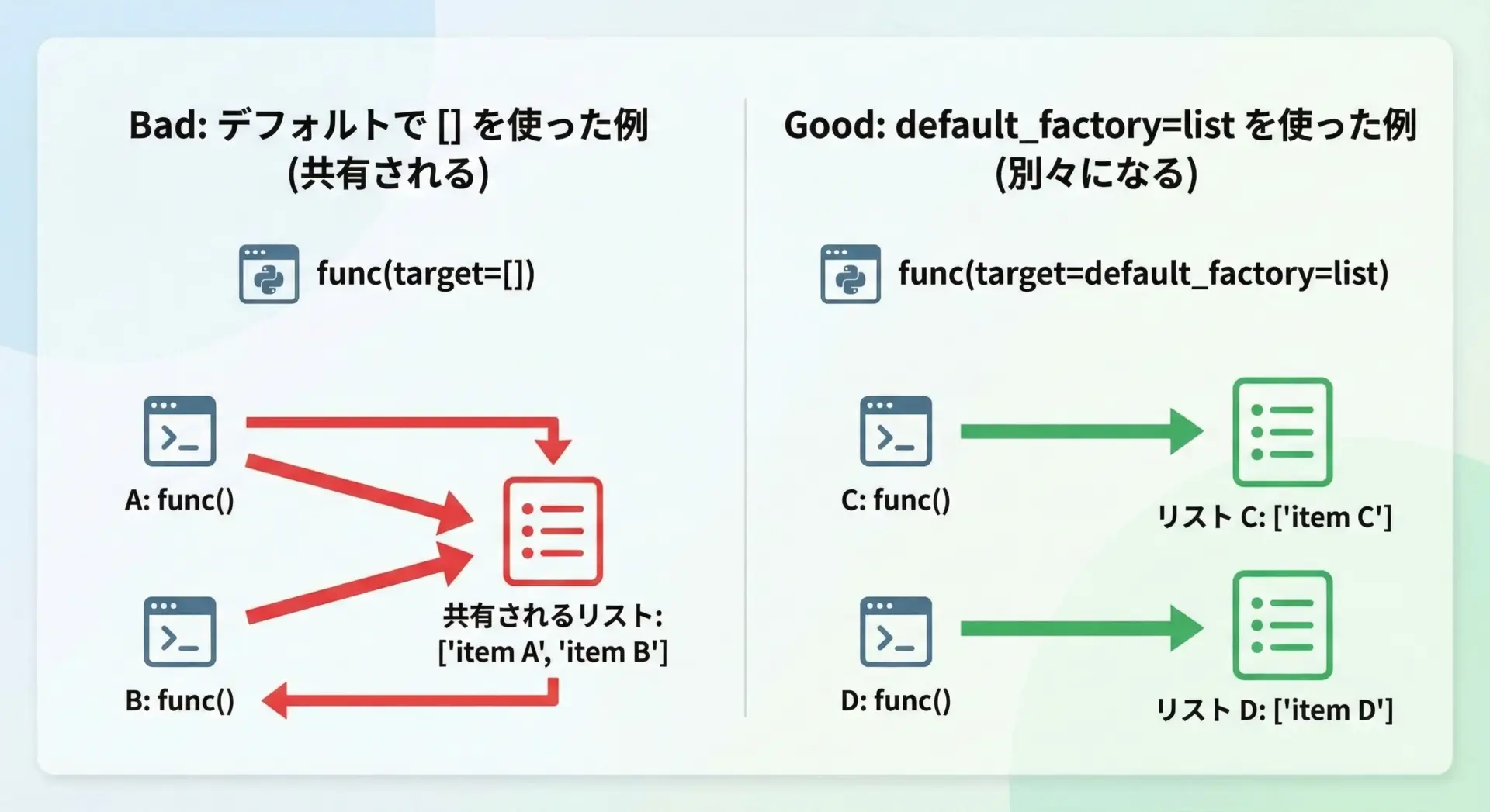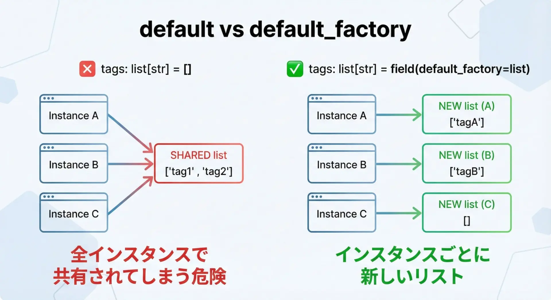 そのため、dataclassesではdefaultdefault_factoryを使い分けることが重要です。