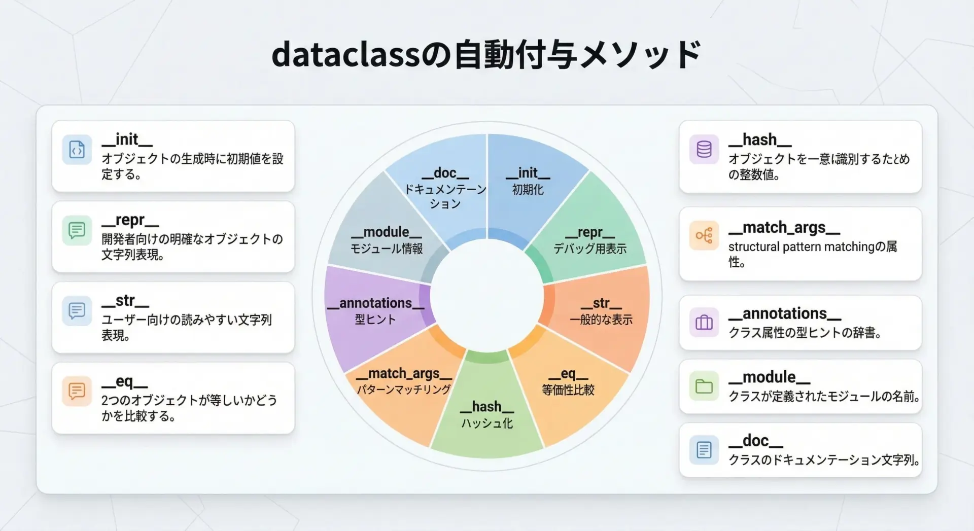 モジュール名はdataclassesで、クラス定義の上に@dataclassデコレータを付けることで、以下のようなメソッドを自動生成してくれます。