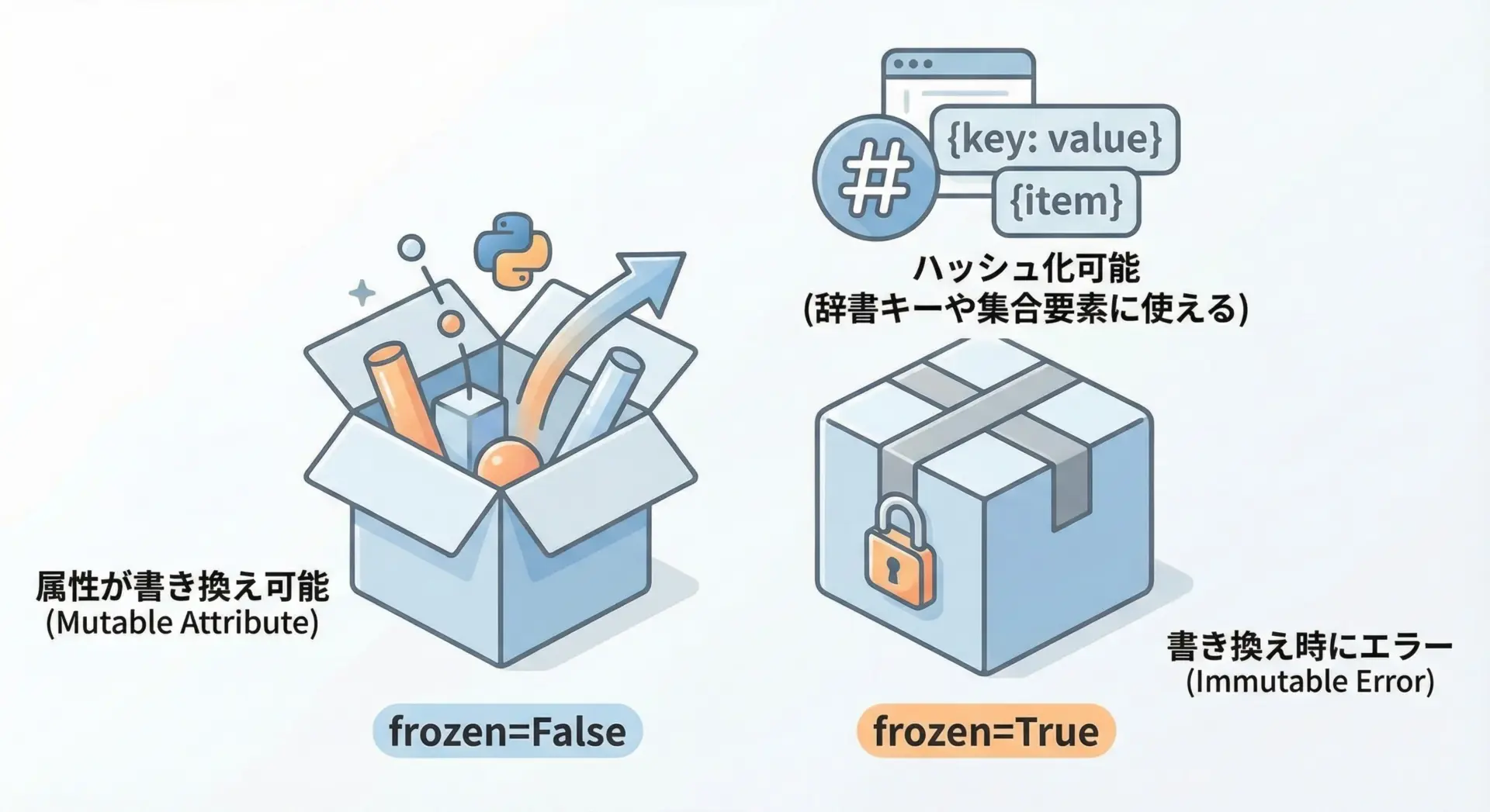 dataclassesにはfrozen=Trueというオプションがあり、これを指定するとイミュータブル(変更不可)なデータクラスを定義できます。
