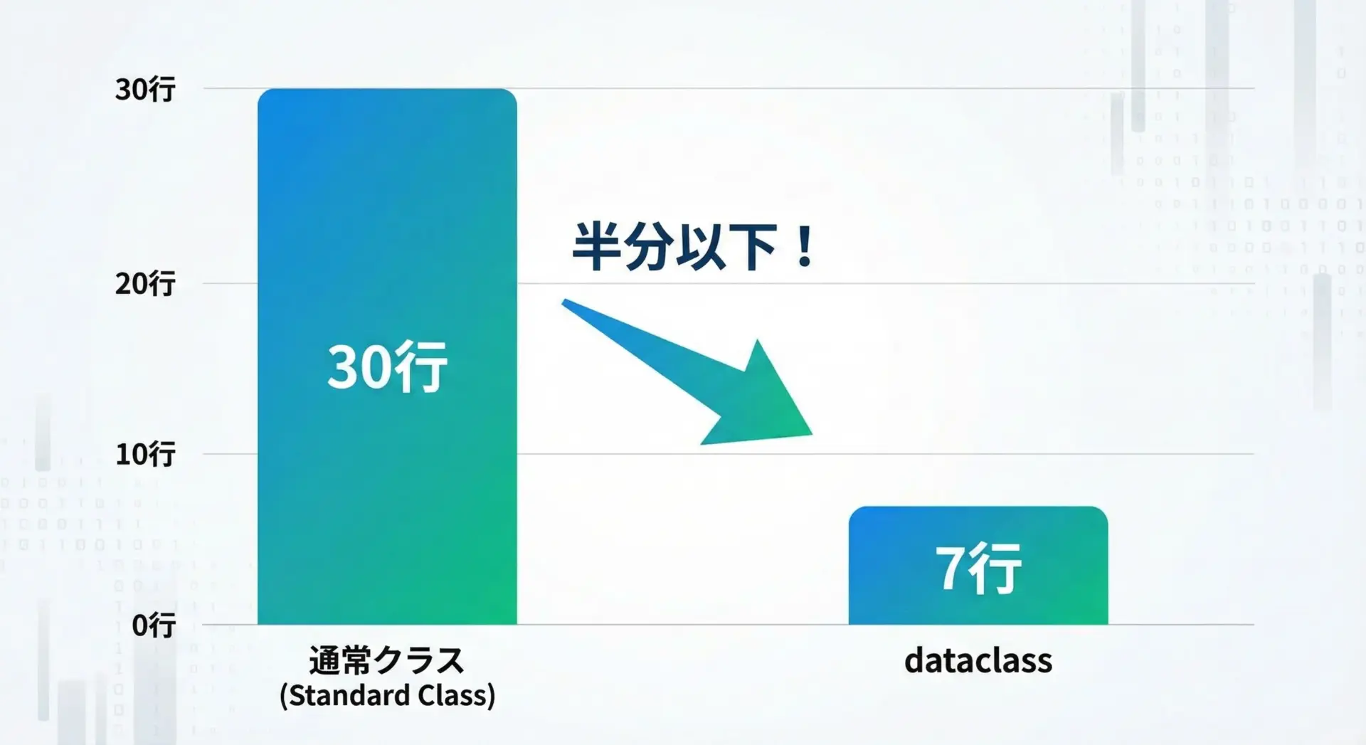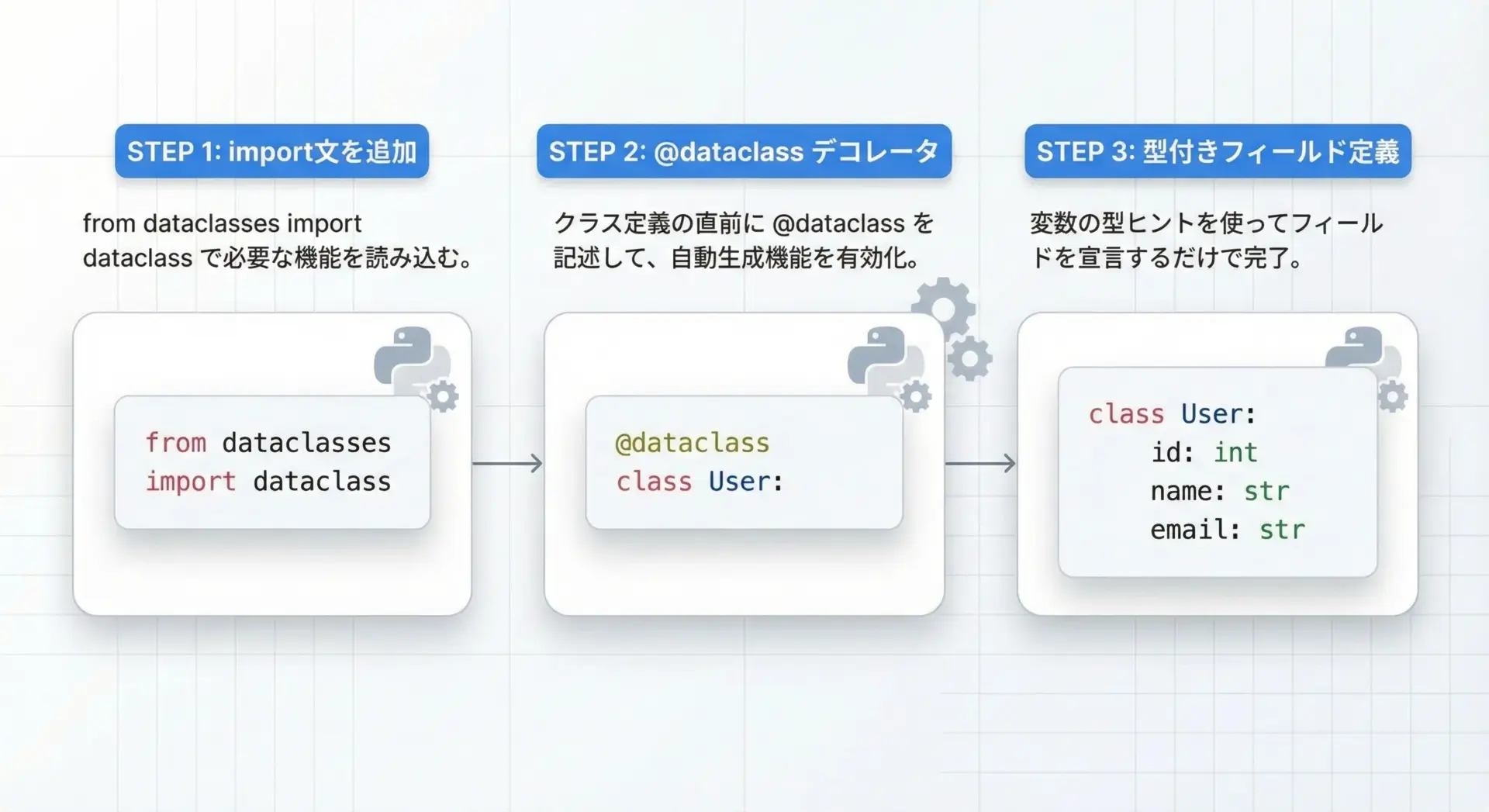 @dataclassデコレータと型ヒントを使うだけで、コンストラクタや比較メソッドなどの定型コードを自動生成でき、クラス定義をデータモデルそのものに集中させることができます。