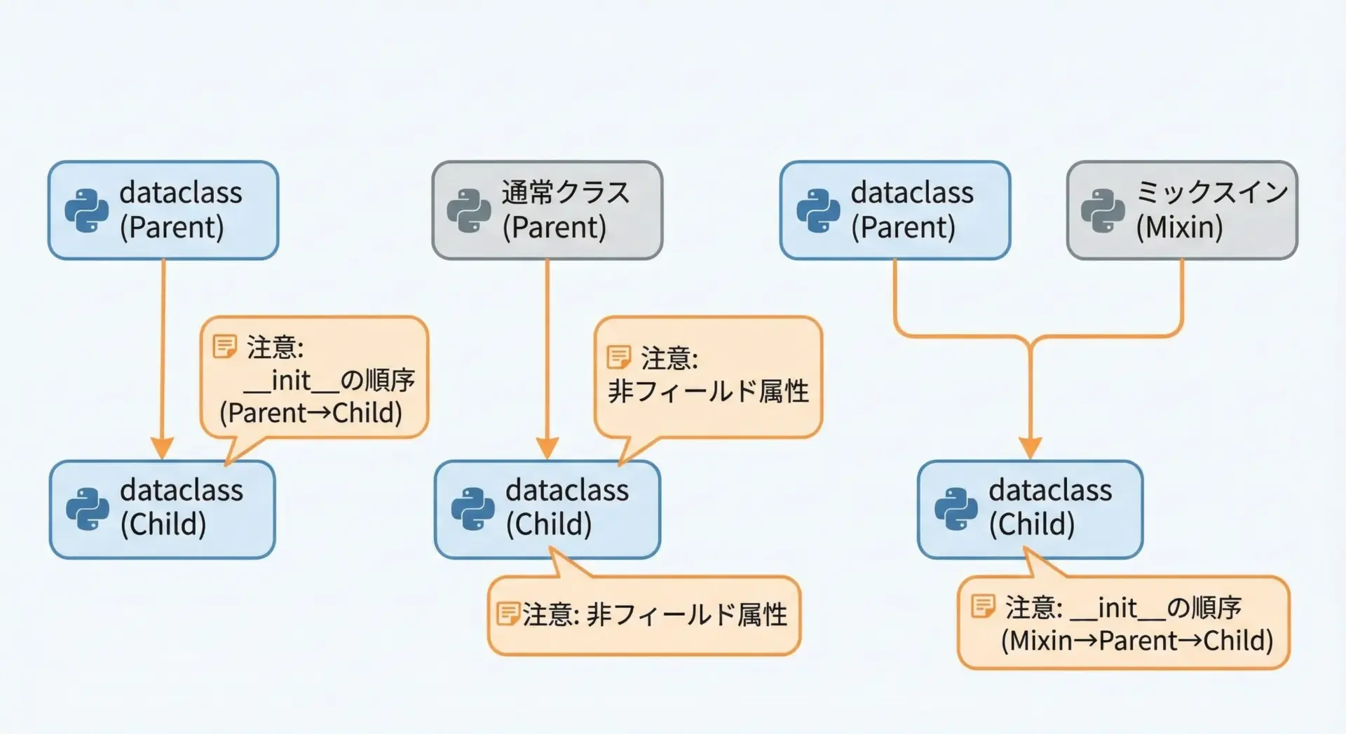 dataclassesは継承にも対応していますが、フィールドの順序や初期化の順番など、いくつか注意すべき点があります。
