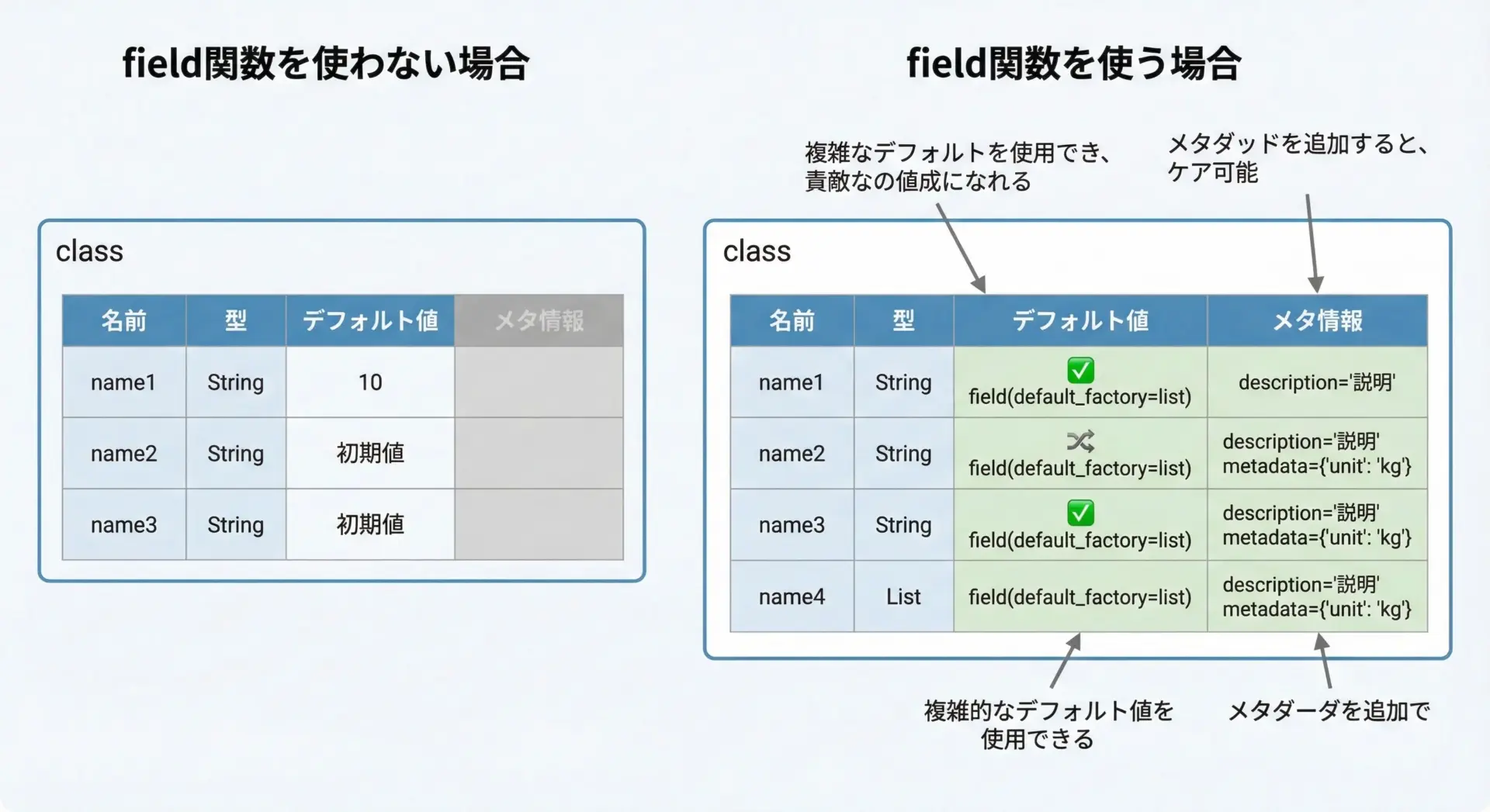 型ヒントは必須ではありませんが、型ヒントがあることでdataclassesはその属性を「フィールド」として認識し、自動生成メソッドに反映します。