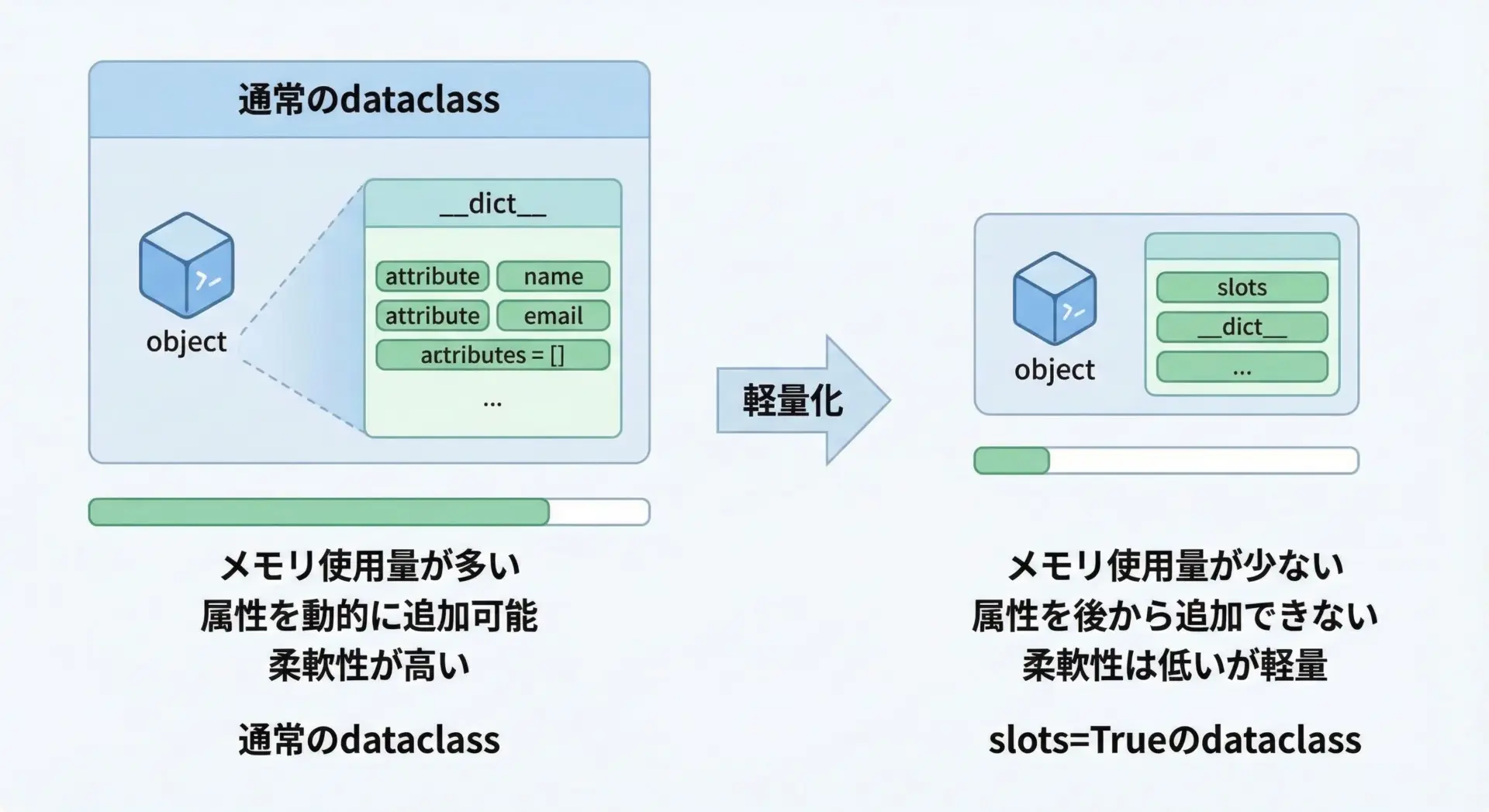 Python 3.10以降では、@dataclassslots=Trueオプションを指定することで、__slots__を利用した軽量なdataclassを定義できます。