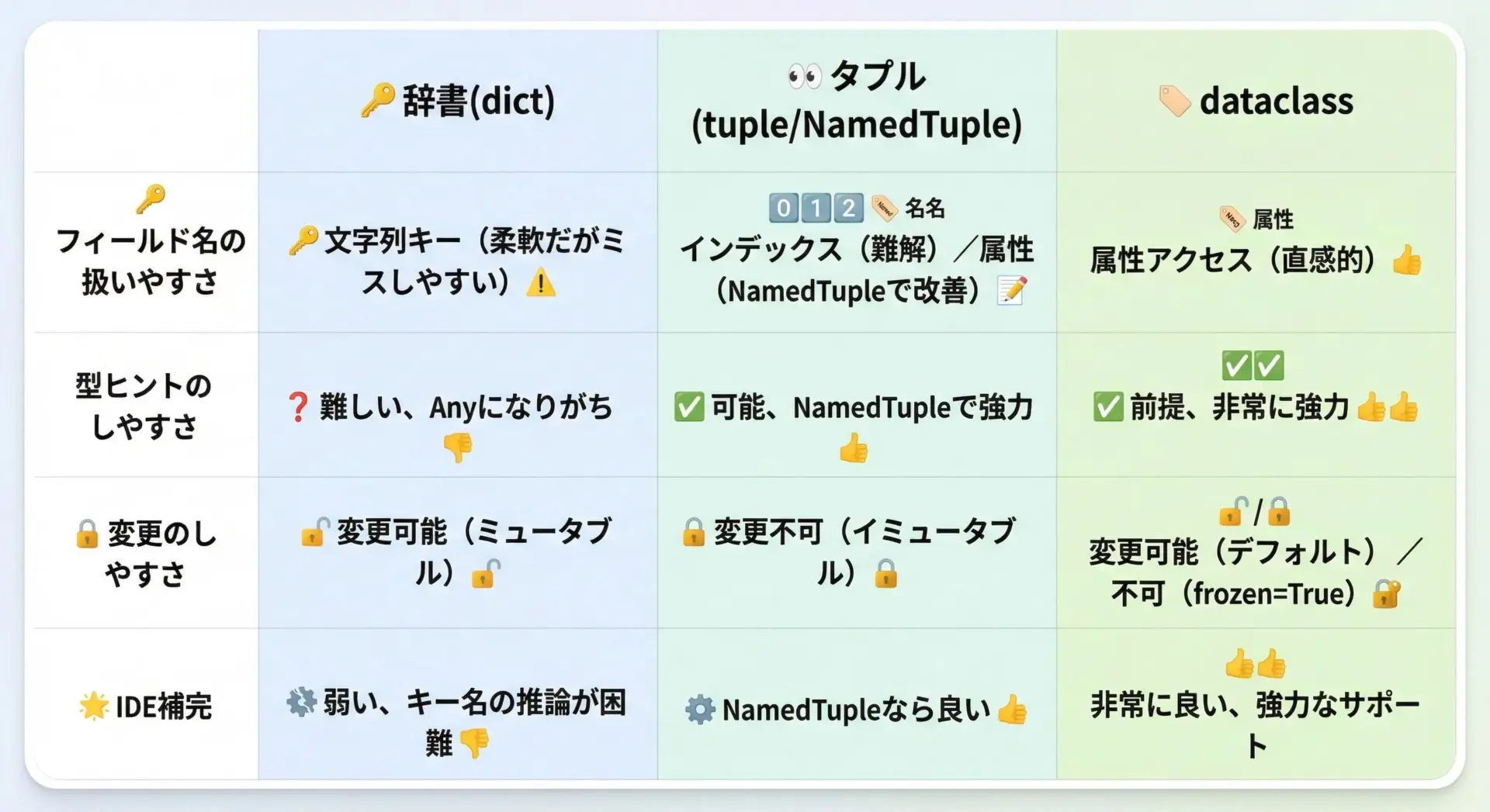 また、NamedTupleも強力な手段ですが、フィールドのデフォルト値設定や、後からの拡張性の面でやや扱いづらい場合があります。