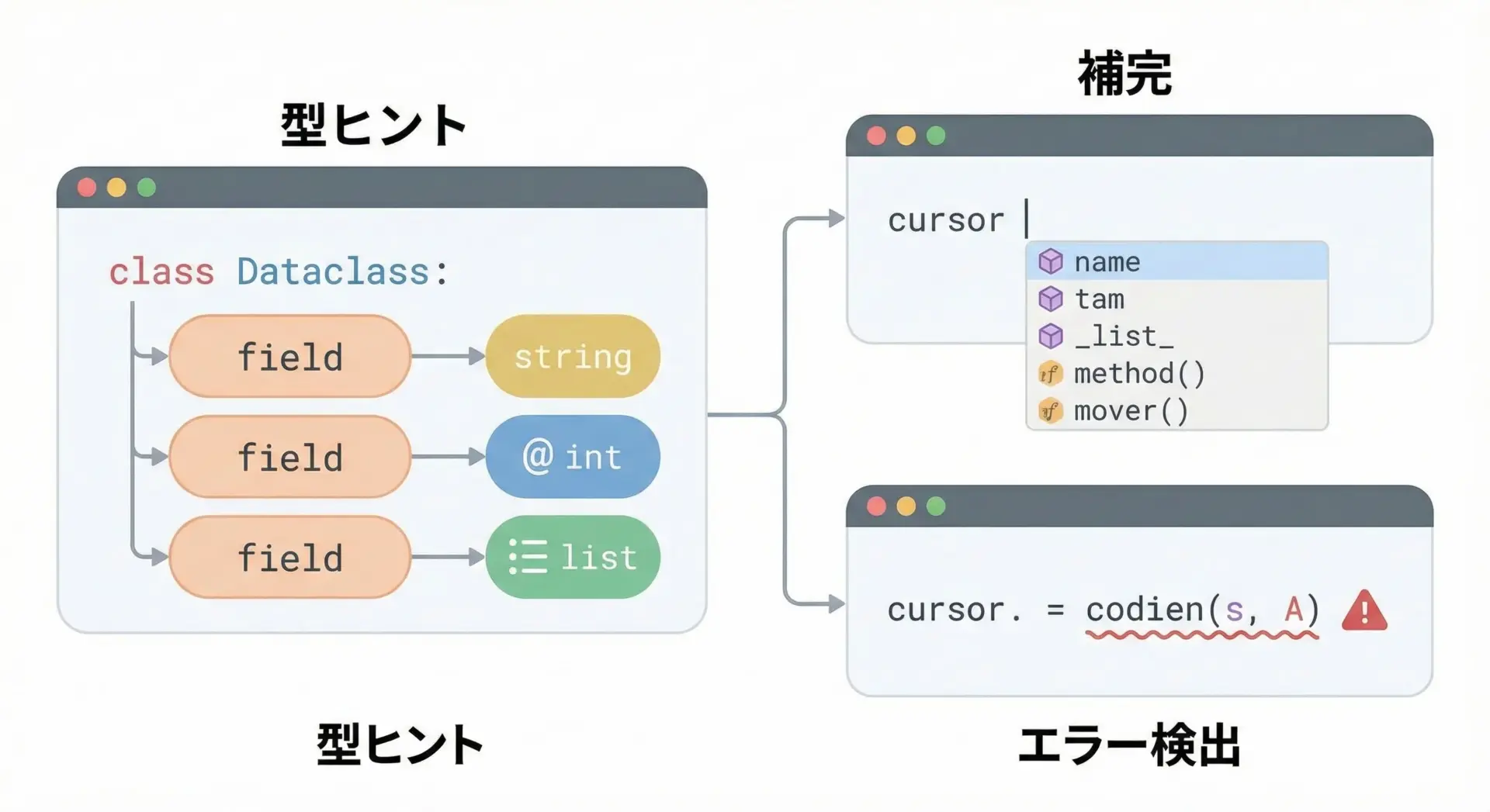 型ヒントとdataclassesを組み合わせることで、動的言語でありながら型安全性をある程度担保できるようになります。