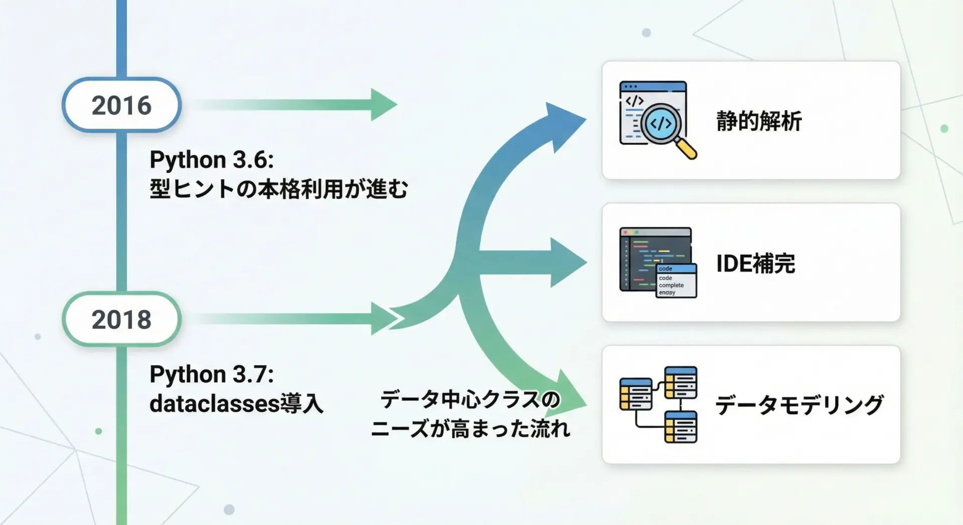 dataclassesが導入された背景には、Pythonコミュニティでの型ヒント(type hints)の普及があります。