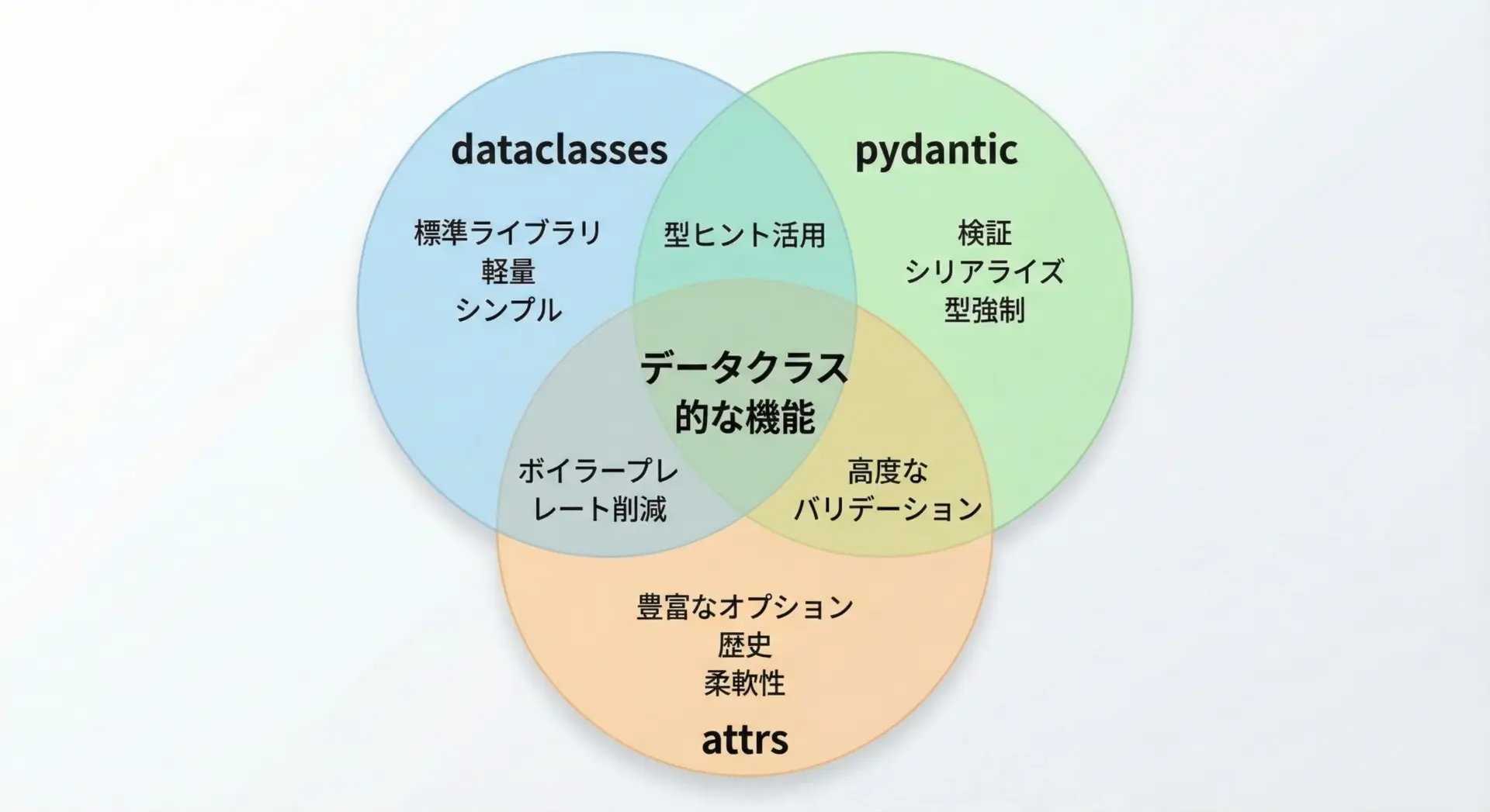 dataclassesはこの中間に位置し、「クラスの分かりやすさ」と「宣言的なデータ定義」の両方をバランスよく提供してくれます。