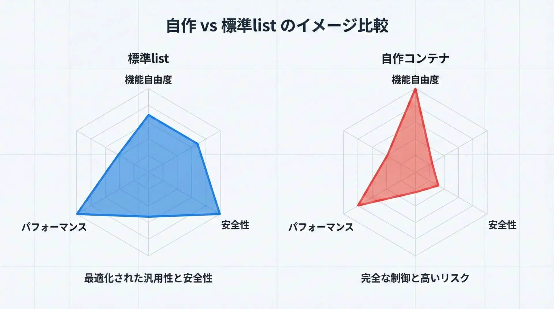 自分で「リスト風のコンテナ」を作ってみると、標準listがどのような設計思想で作られているかを自然と意識するようになります。
