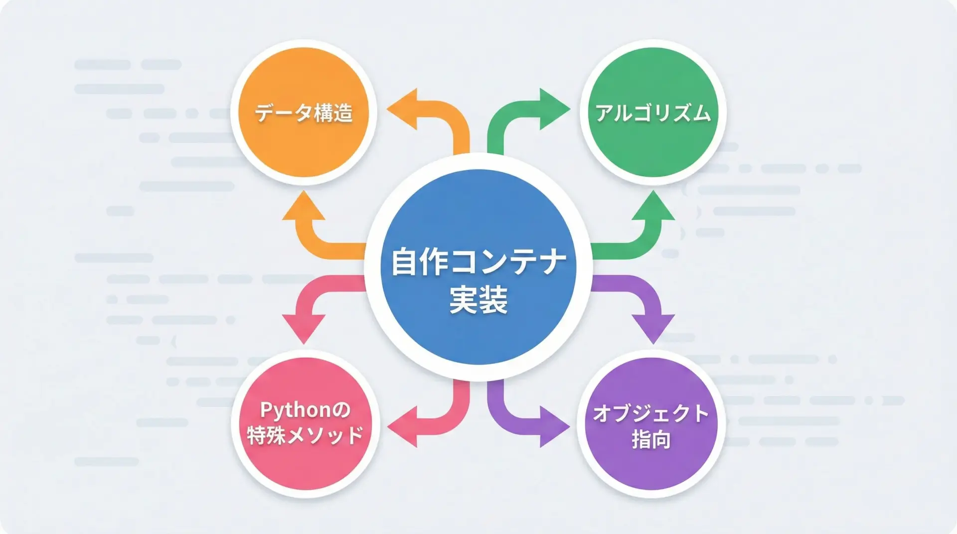 Pythonで標準のlistに慣れてくると、「自分でコンテナ型を作れたら便利そう」と感じる場面が増えてきます。