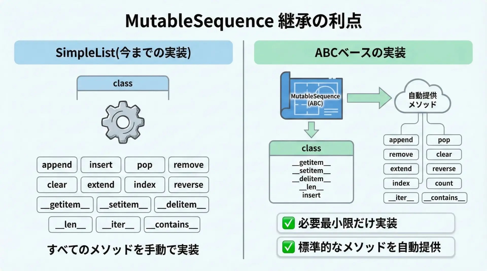 MutableSequenceを使うことで、自作コンテナのインターフェースが「Python標準の期待するシーケンスAPI」に自然と揃う点も大きな利点です。