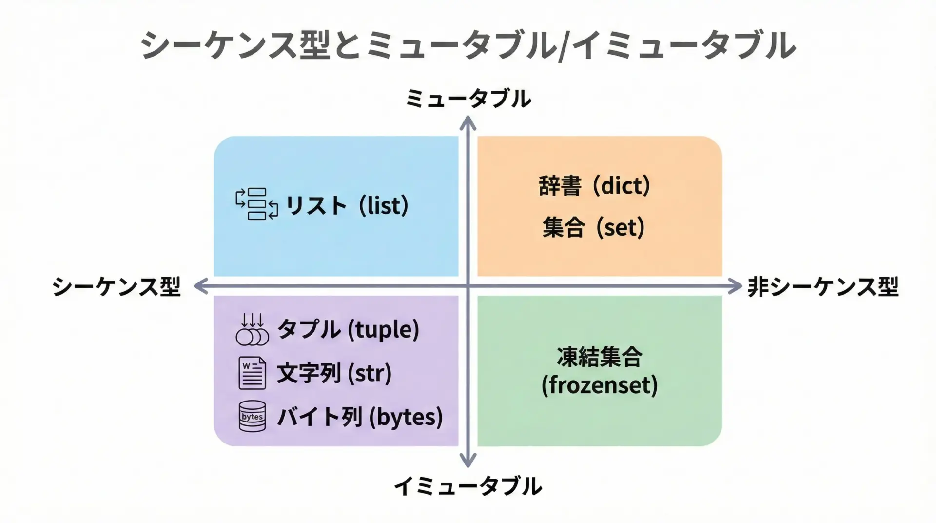 一方で、dictやsetは順序は扱いますが「シーケンス」というよりは「マッピング」「集合」として分類されます。
