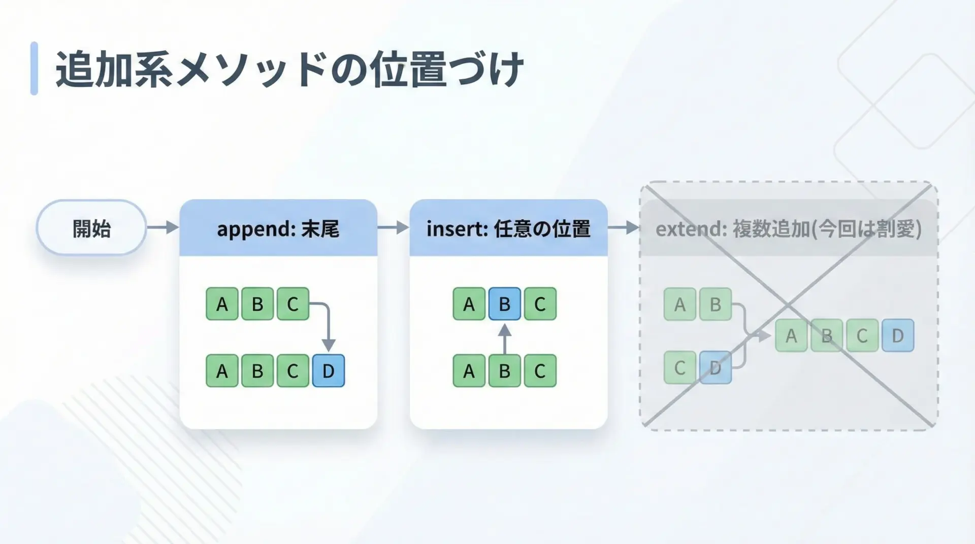 appendやinsertの挙動を自分で書いてみることで、「先頭への挿入がなぜ遅くなりがちなのか」といった疑問にも具体的な感覚が伴うようになります。