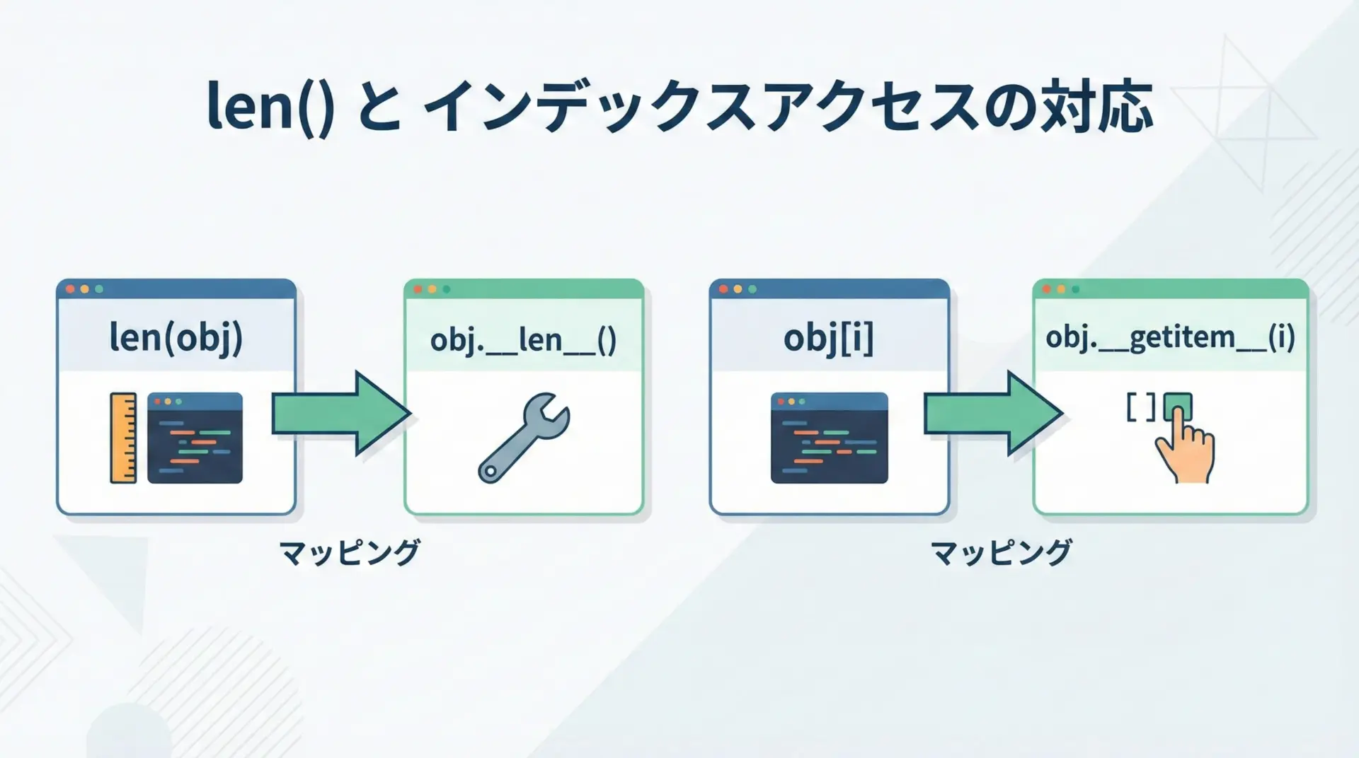 • 基本的なインターフェースとして、要素数を返す__len__、インデックスアクセスを提供する__getitem__が重要です。これだけでかなり「コンテナらしく」なります。