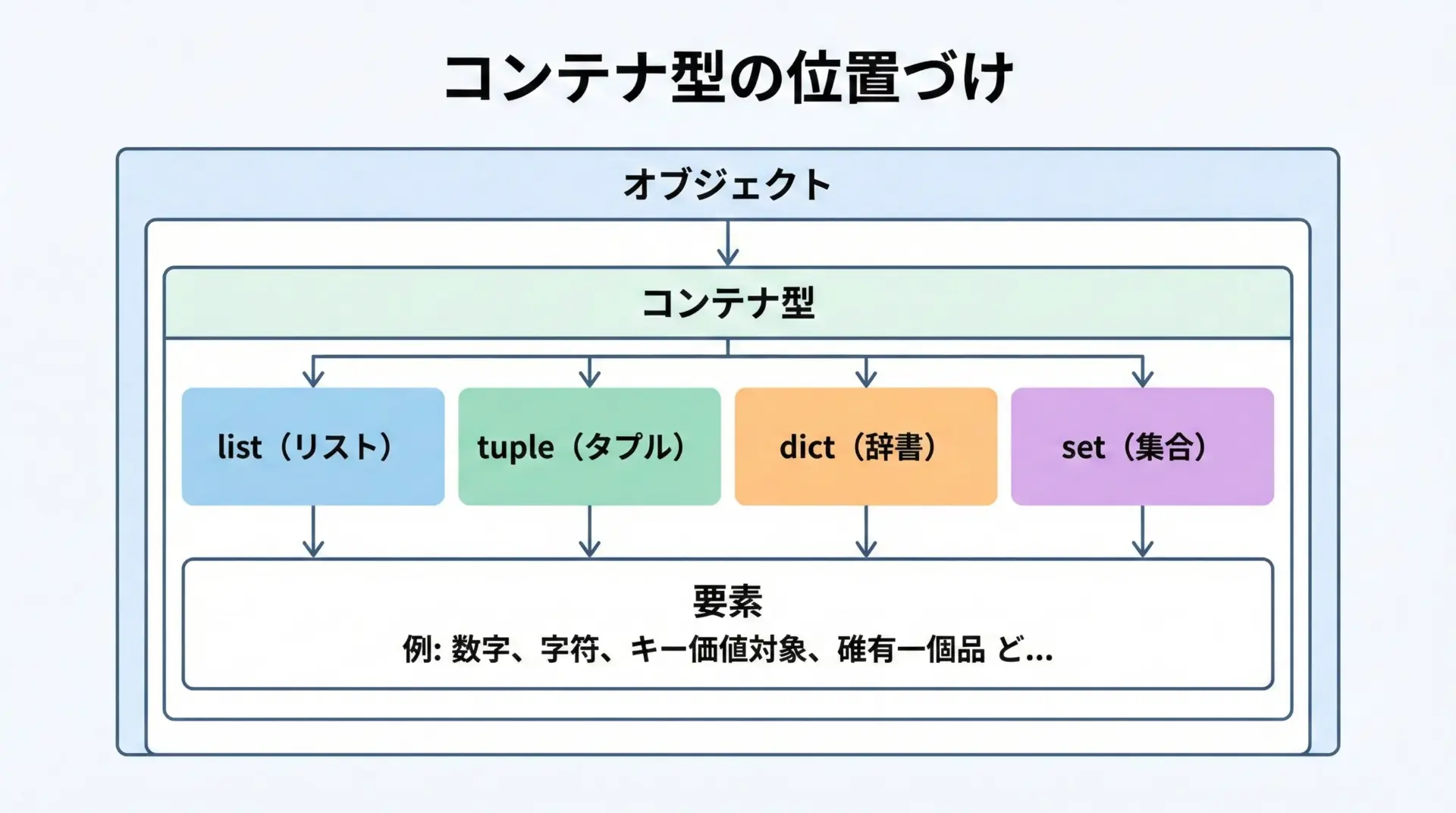 Pythonにおけるコンテナ型とは、「複数の要素をまとめて保持し、要素へのアクセス手段を提供するオブジェクト」のことです。