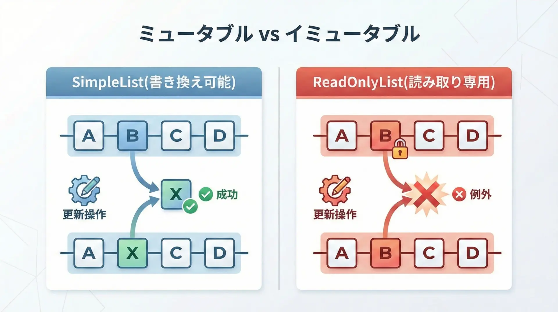 ミュータブルかイミュータブルかは、生成後に中身を変更できるかどうかの違いです。
