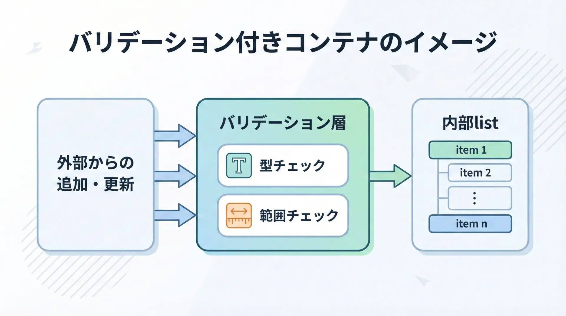 この記事では、Pythonのコンテナ型を理解するために、内部にlistを保持するリスト風クラスをゼロから実装する流れを追いながら、バリデーション付きコンテナや読み取り専用コンテナ、スライス対応、collections.abc.MutableSequenceの活用、型ヒントによるジェネリックコンテナなど、実務にもつながる発展的なテクニックを紹介しました。