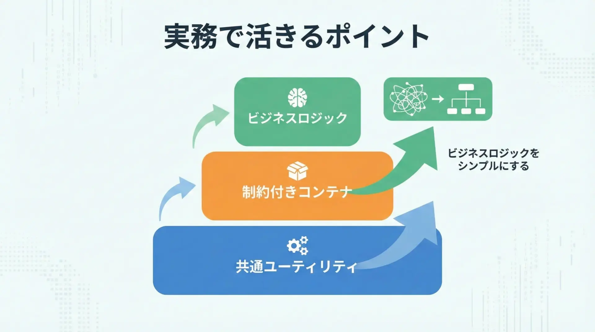 • ビジネスロジックやルール表現が重要な箇所では、自作コンテナで抽象化と制約を明示する。