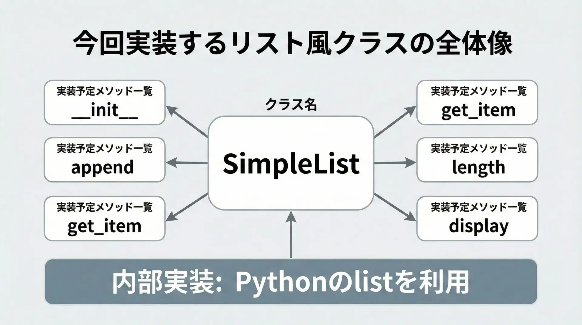 標準listで十分な場面が大半ですが、あえて自作することで「なぜlistはこの振る舞いなのか」「このメソッドはどのように実装されうるのか」を具体的に理解できるようになります。