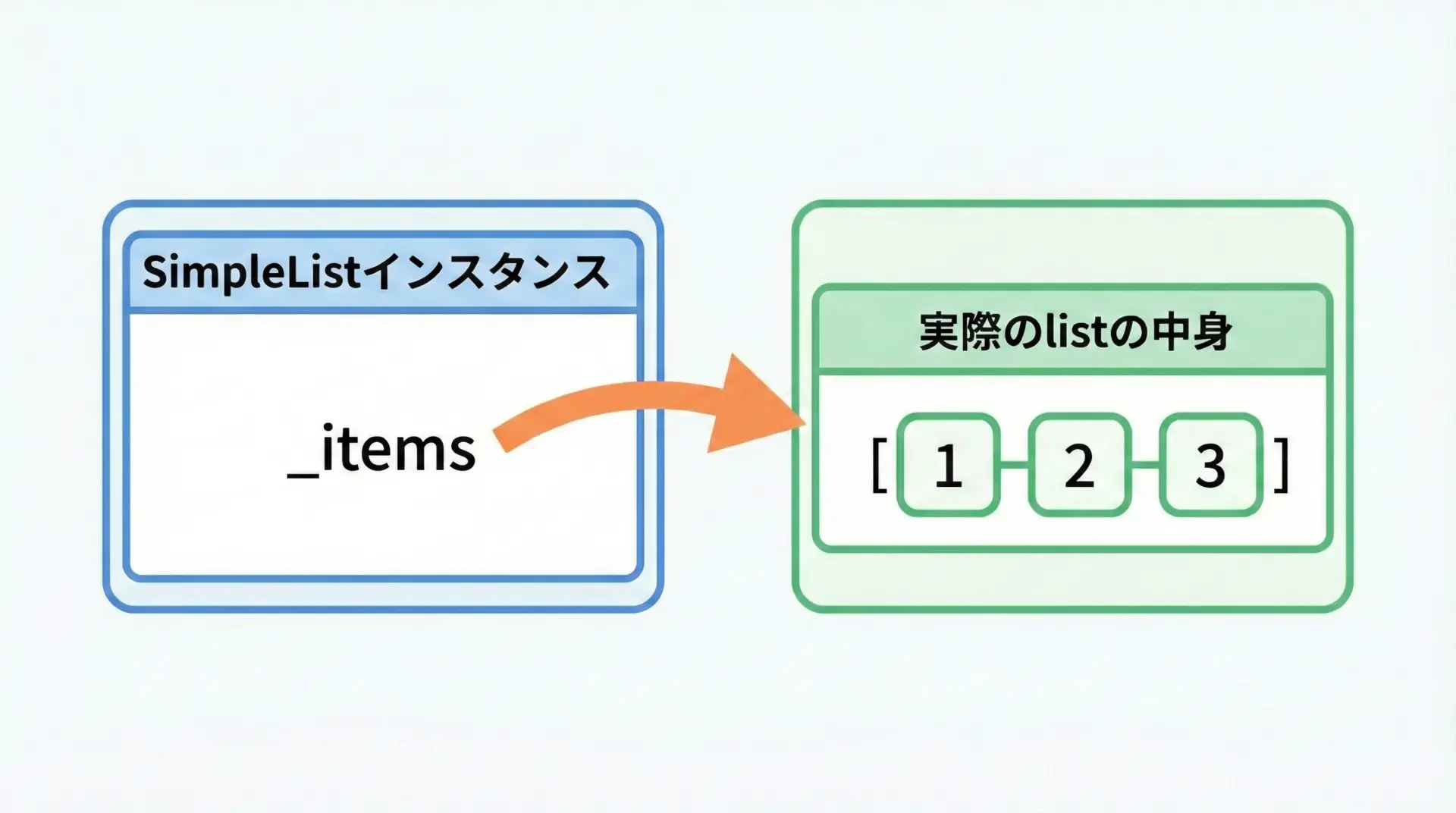この段階では、まだコンテナらしいふるまいはほとんどしませんが、「内部に本物のlistを隠して持つ」という構造だけは明確になりました