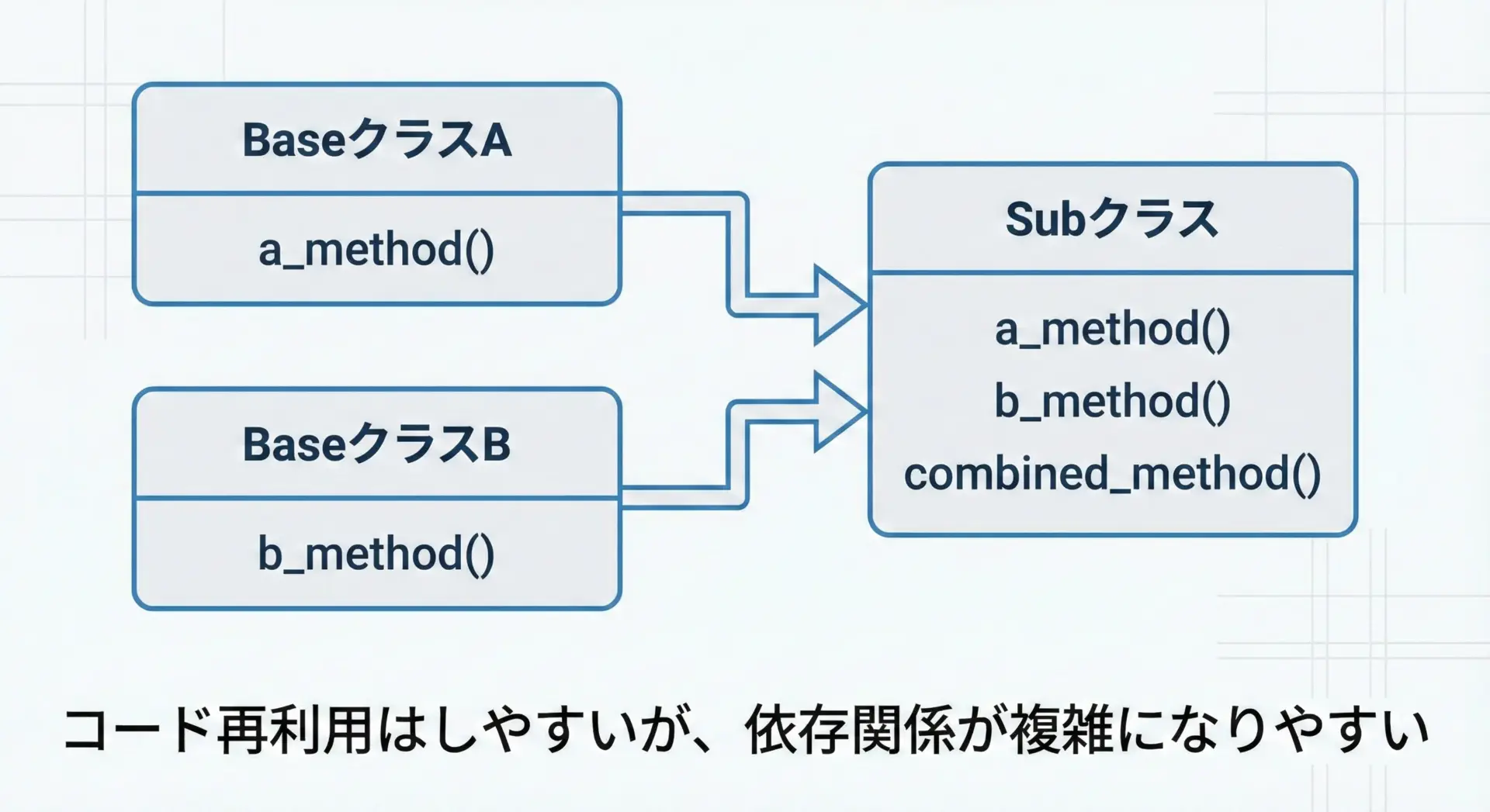 一方で、MROやsuper()の理解が不十分なまま乱用すると、継承ツリーが複雑化し、保守性が急激に低下します。