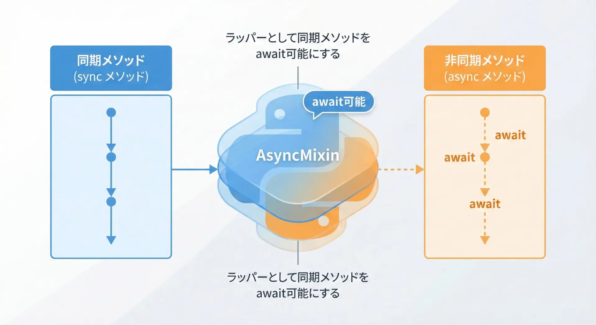 このように、AsyncMixinを使うことで、既存の同期メソッドを大きく書き換えずに非同期インターフェースを提供できます。