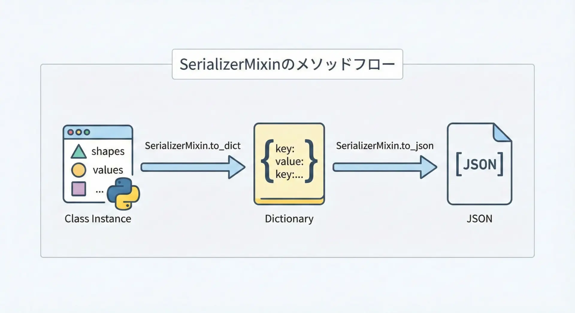 SerializerMixinは状態を持たず、公開属性から辞書を生成するだけなので、さまざまなモデルクラスに簡単に適用できます。