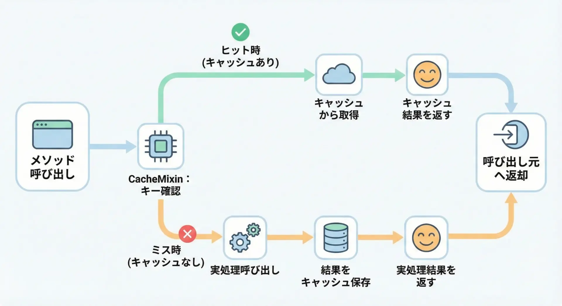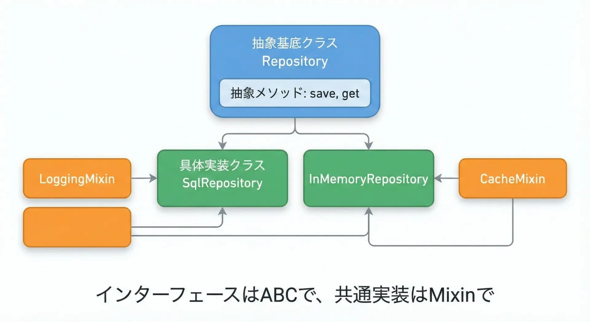 MixinやABCを併用することで、「このクラスはsaveとgetを必ず持つ」といった契約をコードで表現できます。