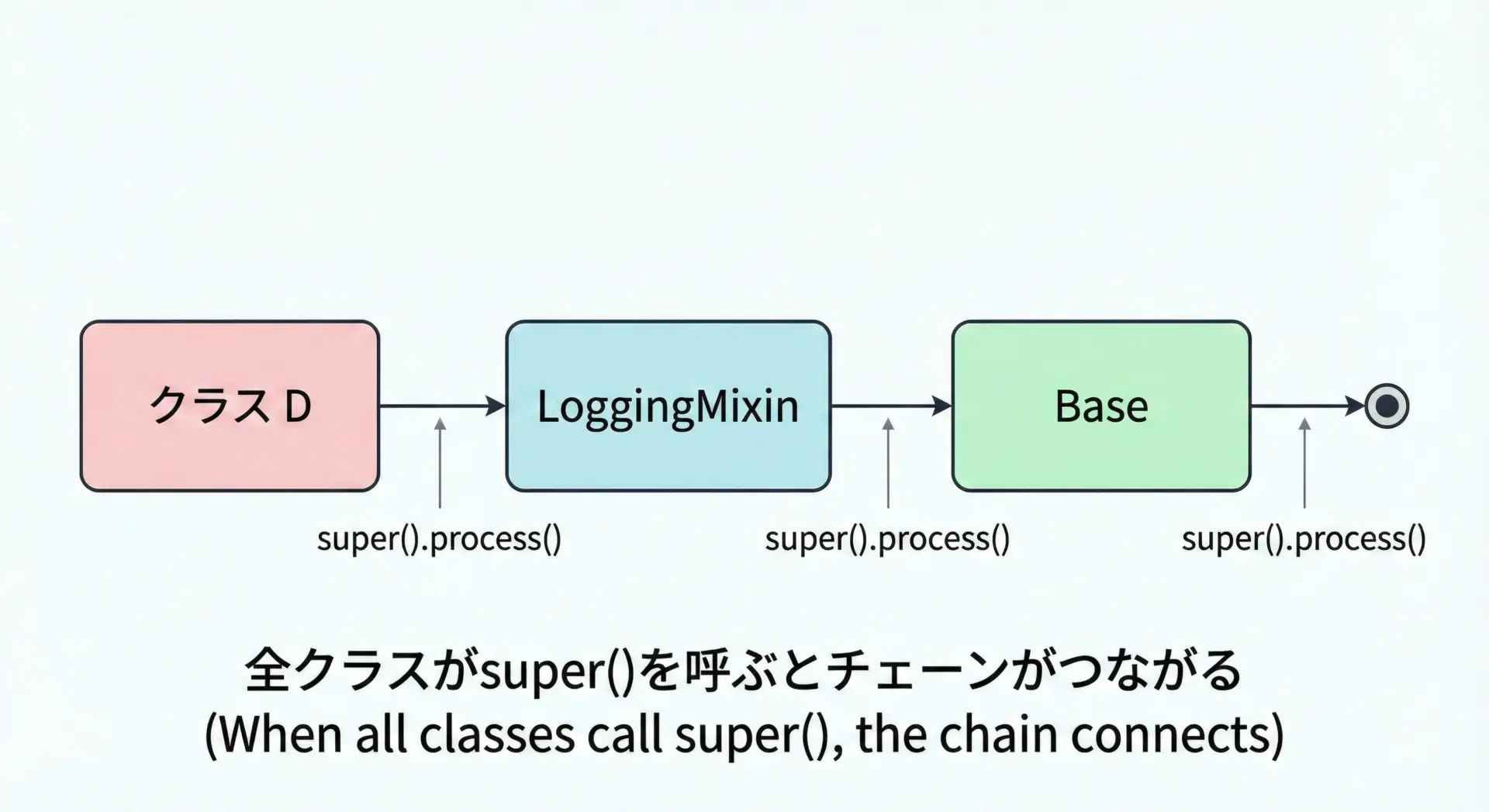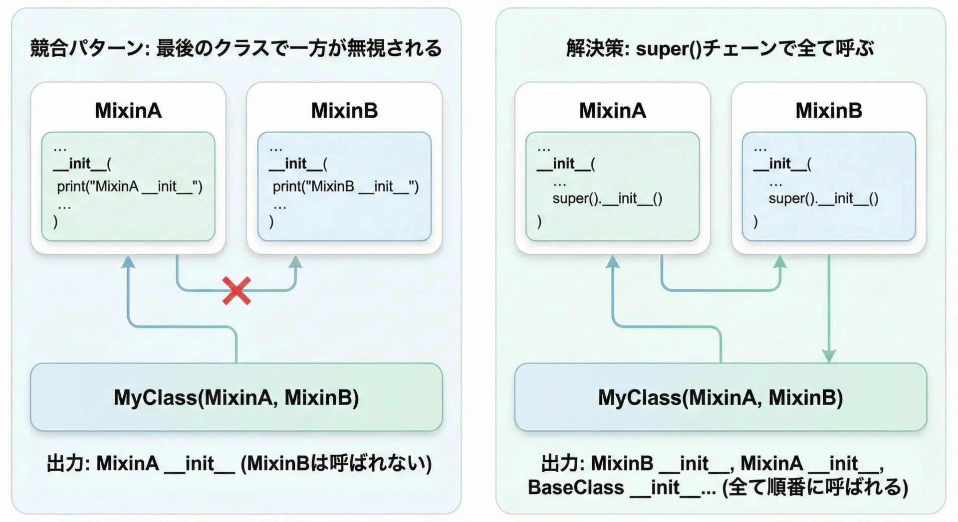 このように、__init__もメソッドチェーンの一部として捉え、全クラスでsuper()を呼ぶことが重要です。