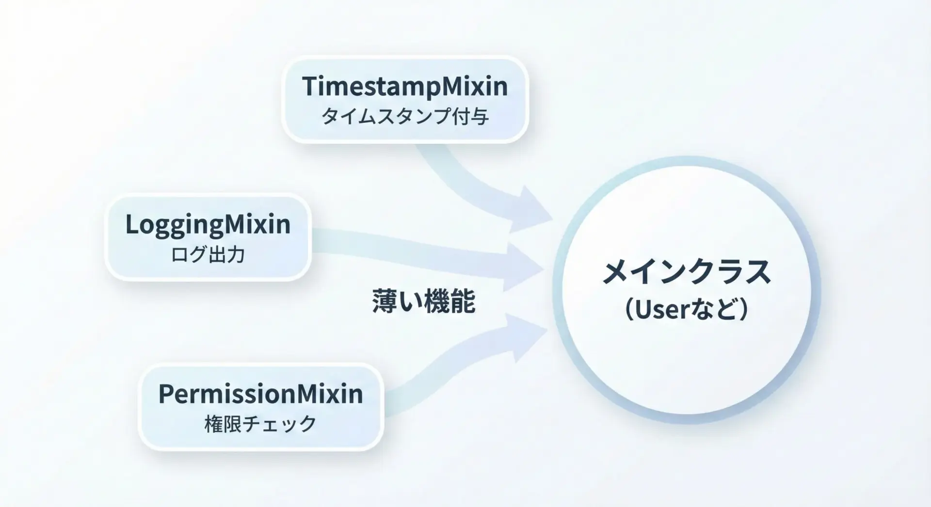 Mixinは、多重継承を用いて特定の機能(振る舞い)だけを別クラスとして切り出し、必要なクラスに「後付け」するための設計パターンです。