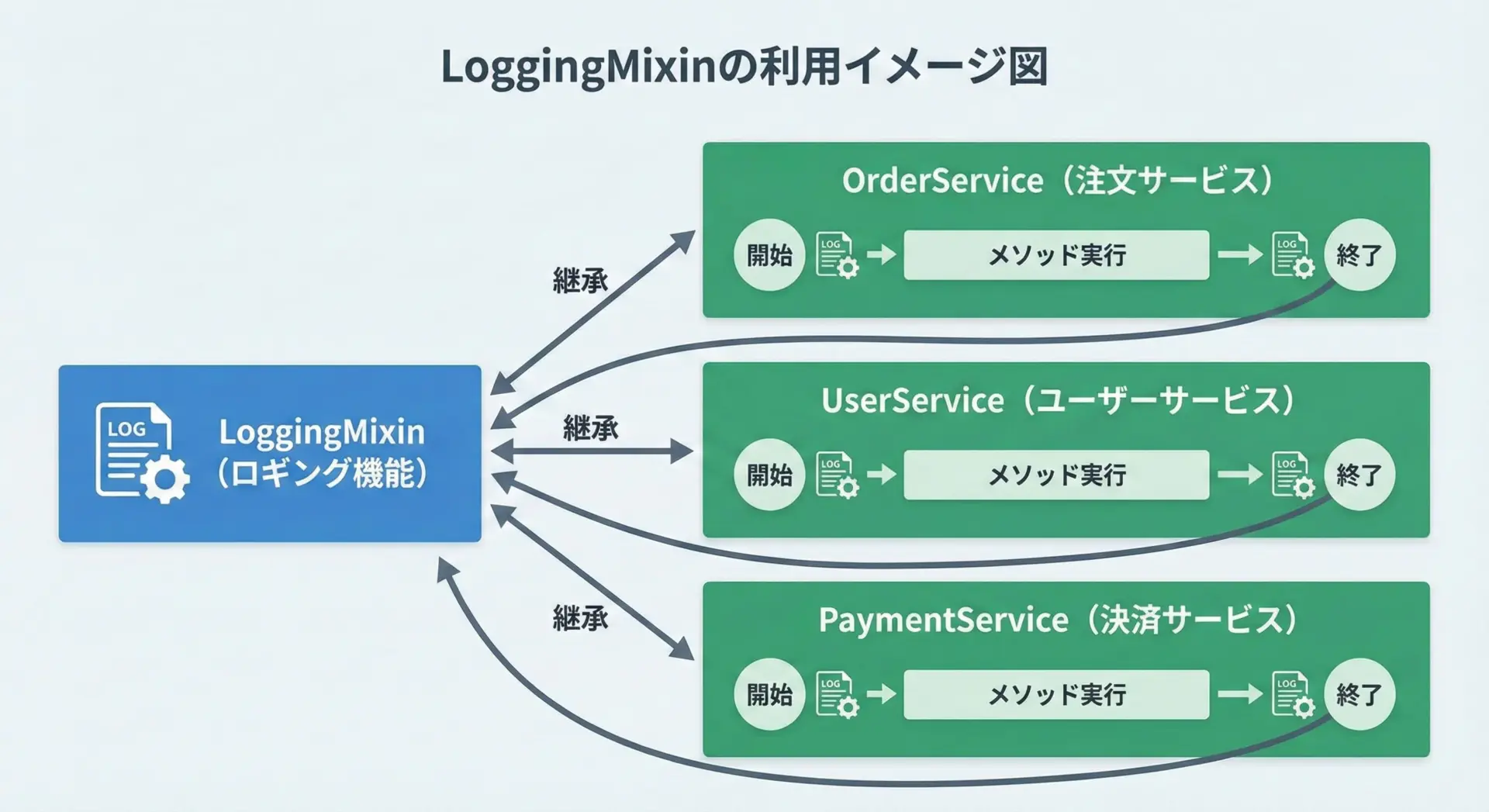 LoggingMixinは、ログ出力という1つの責務に特化しており、任意のクラスに継承して使用できます。