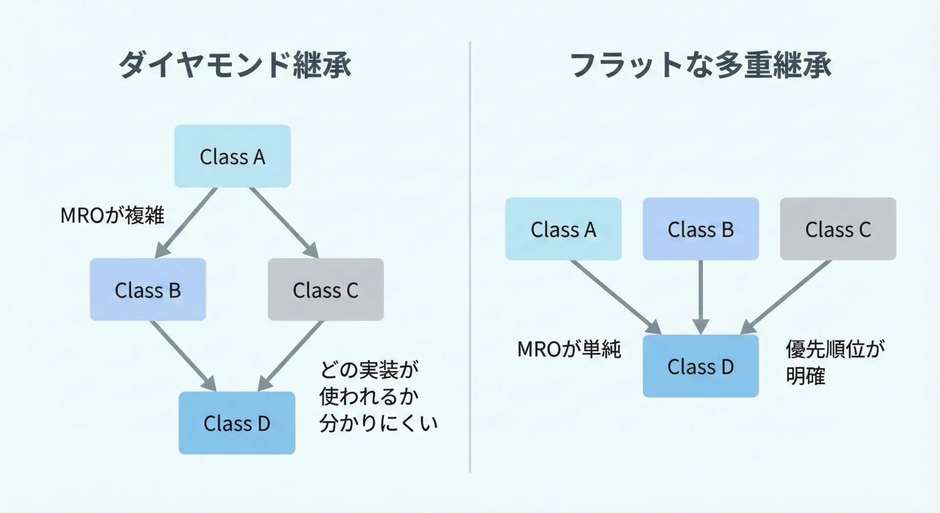 MROを意識した設計を行うことで、多重継承におけるメソッドの衝突や予期せぬ上書きを防げます。