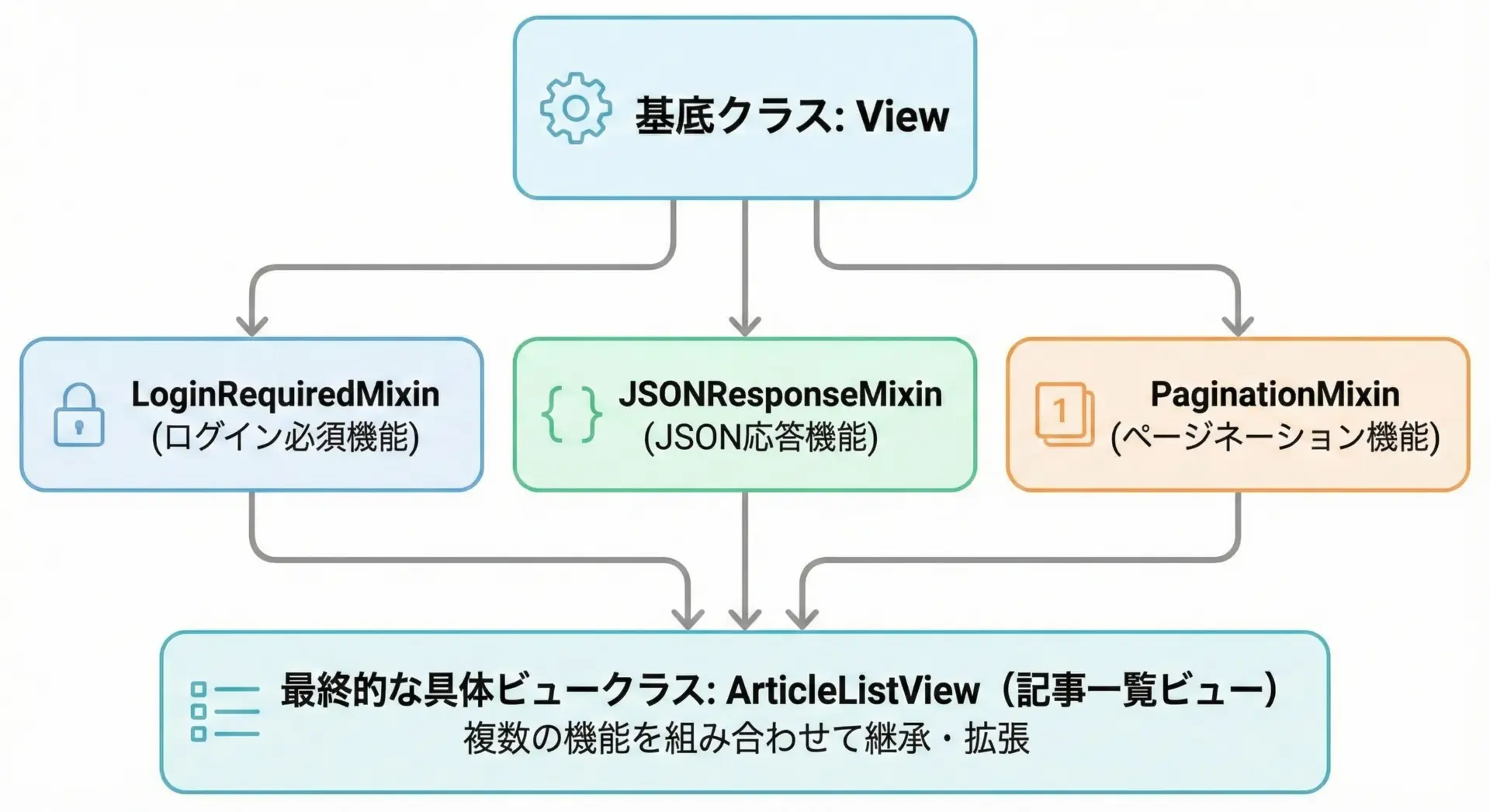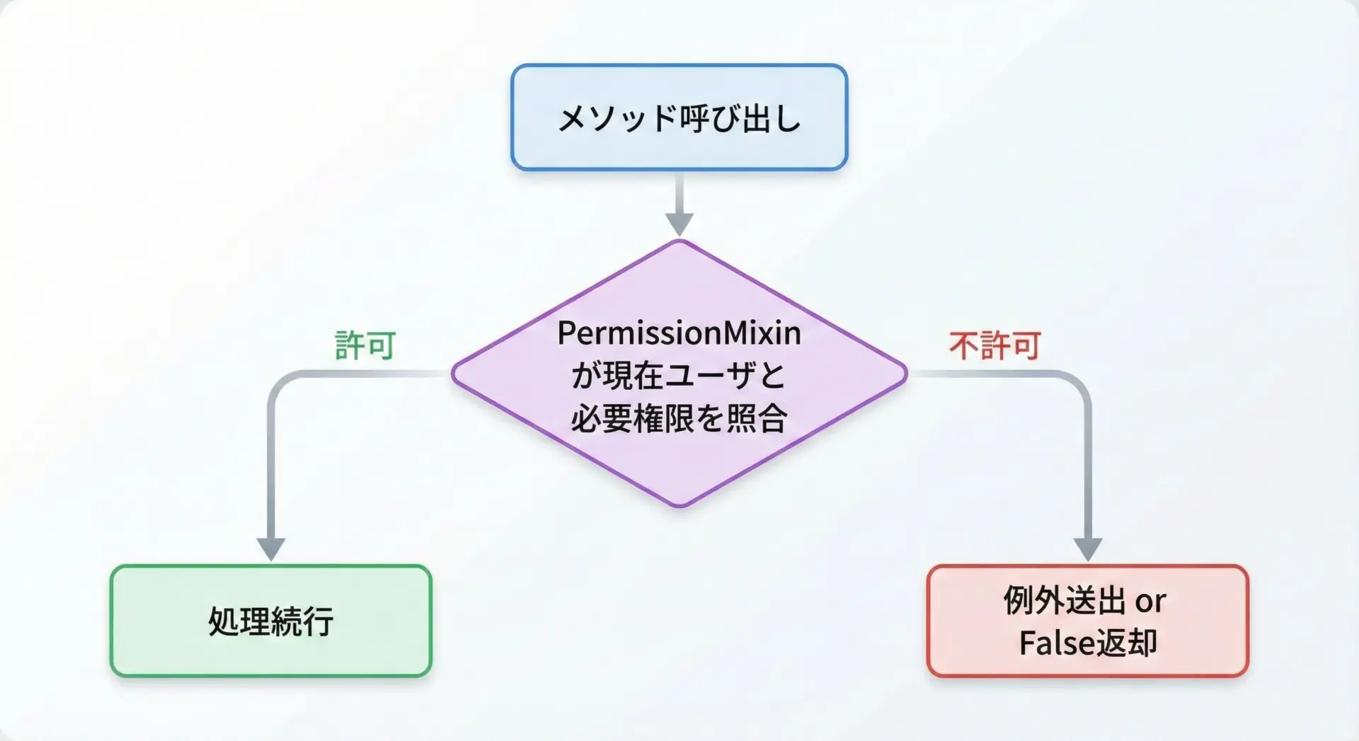 - その後、必要に応じて新しいMixin(例: PermissionMixin)を追加し、同様に段階的に展開する