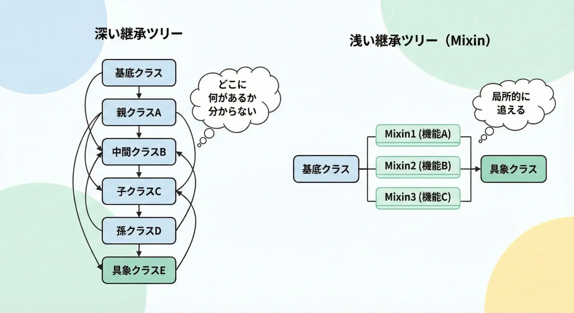 Mixinを使う場合でも、横方向への拡張(Mixinの数)は多少増えても、縦方向(継承の深さ)は抑えるべきです。