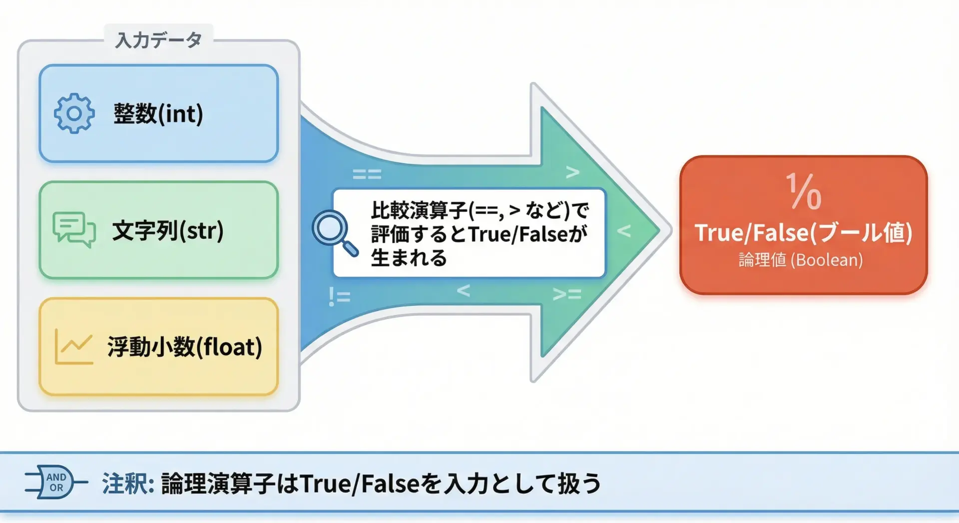 つまり、比較演算子がTrue/Falseを作り、論理演算子がそれらを組み合わせるという流れになります。