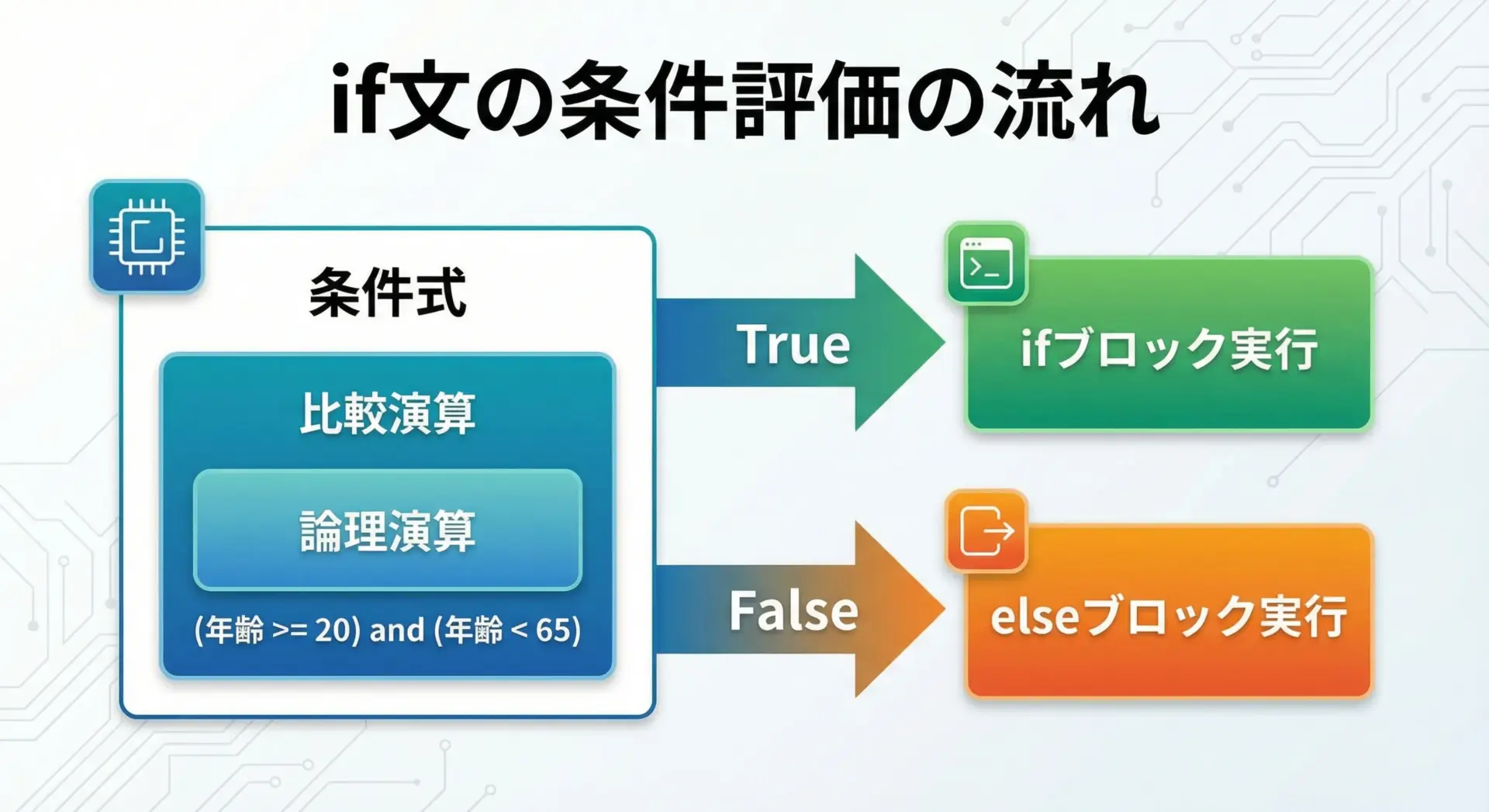 これらを比較演算子と組み合わせて使うことで、if文の条件を柔軟かつ表現豊かに書くことができます。