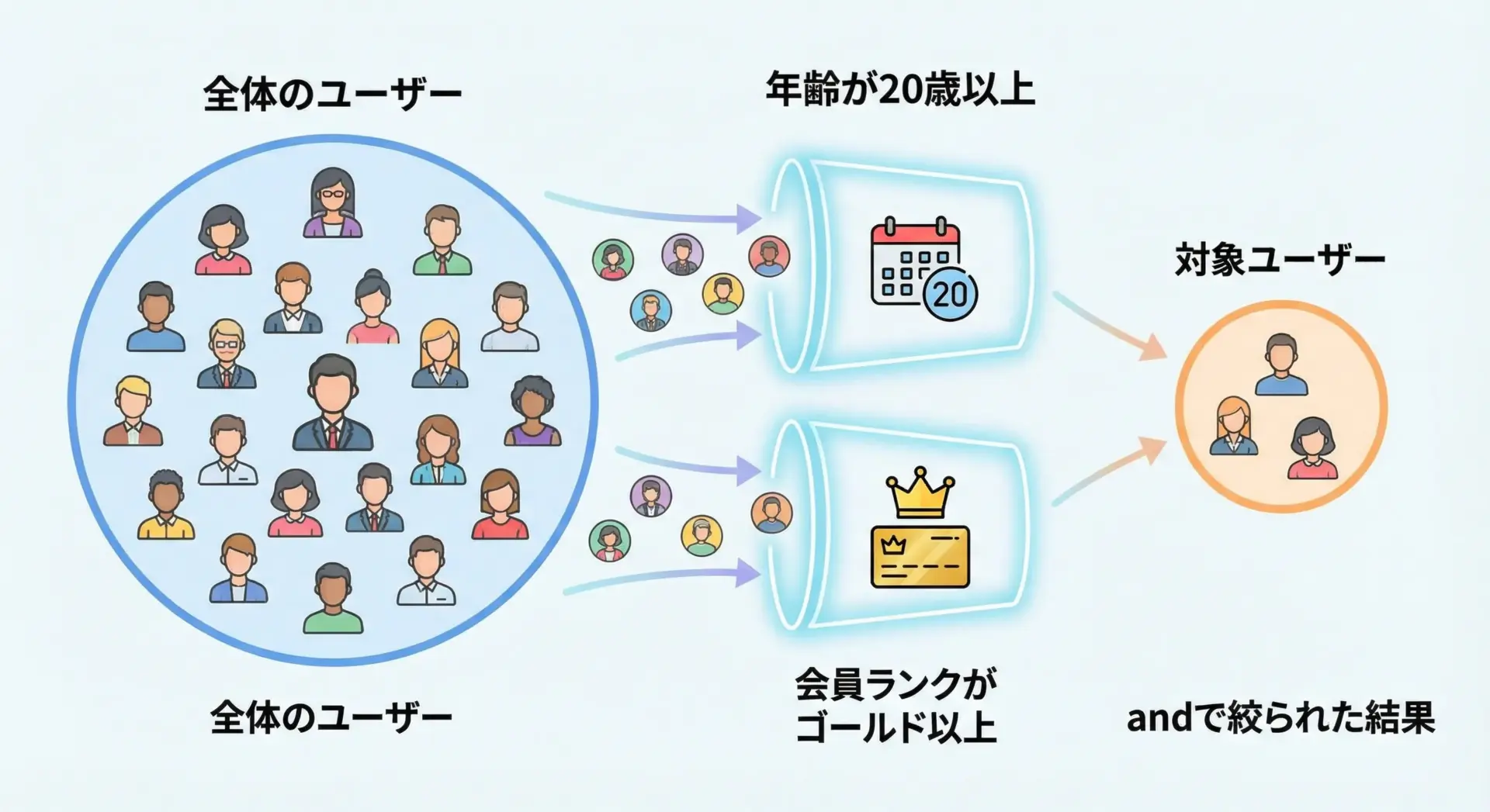 次のサンプルでは、年齢と会員ランクの2つの条件で絞り込む例を示します。