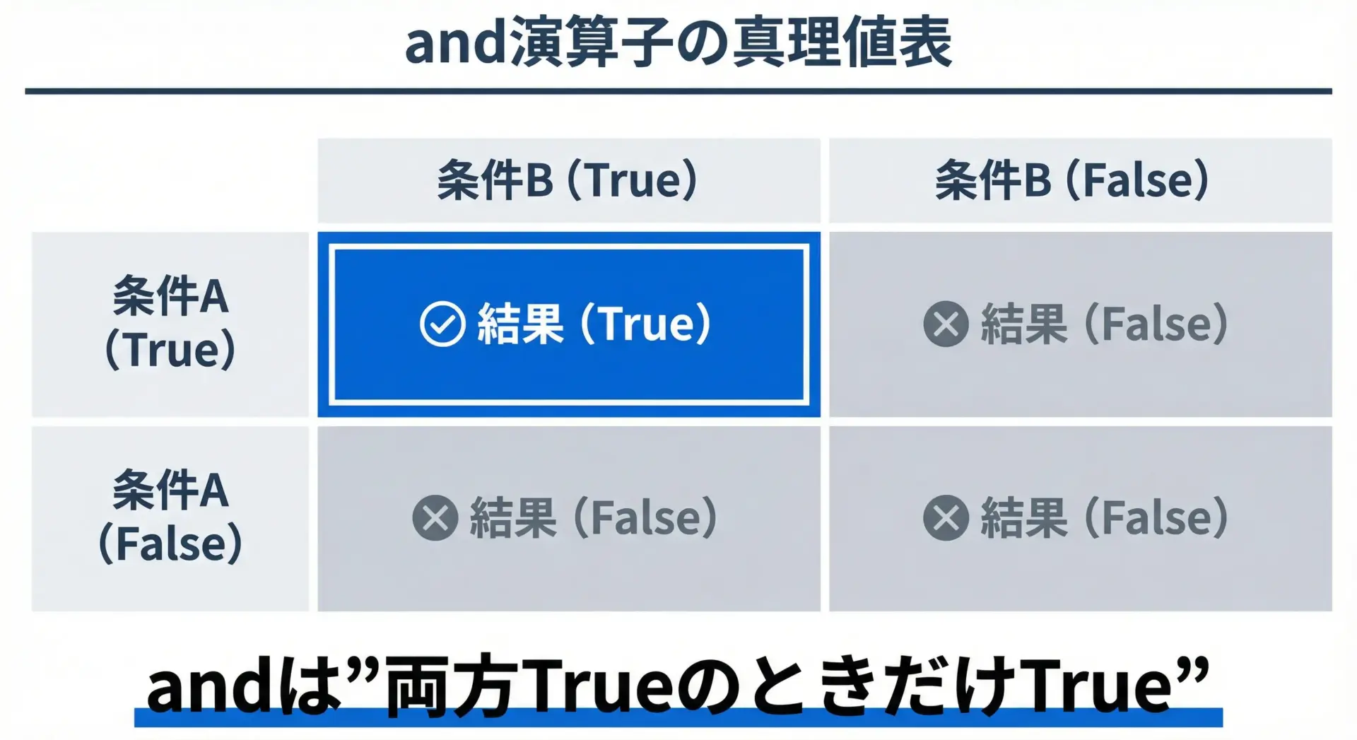 and演算子の基本ルールは「両方ともTrueのときだけTrue」です。