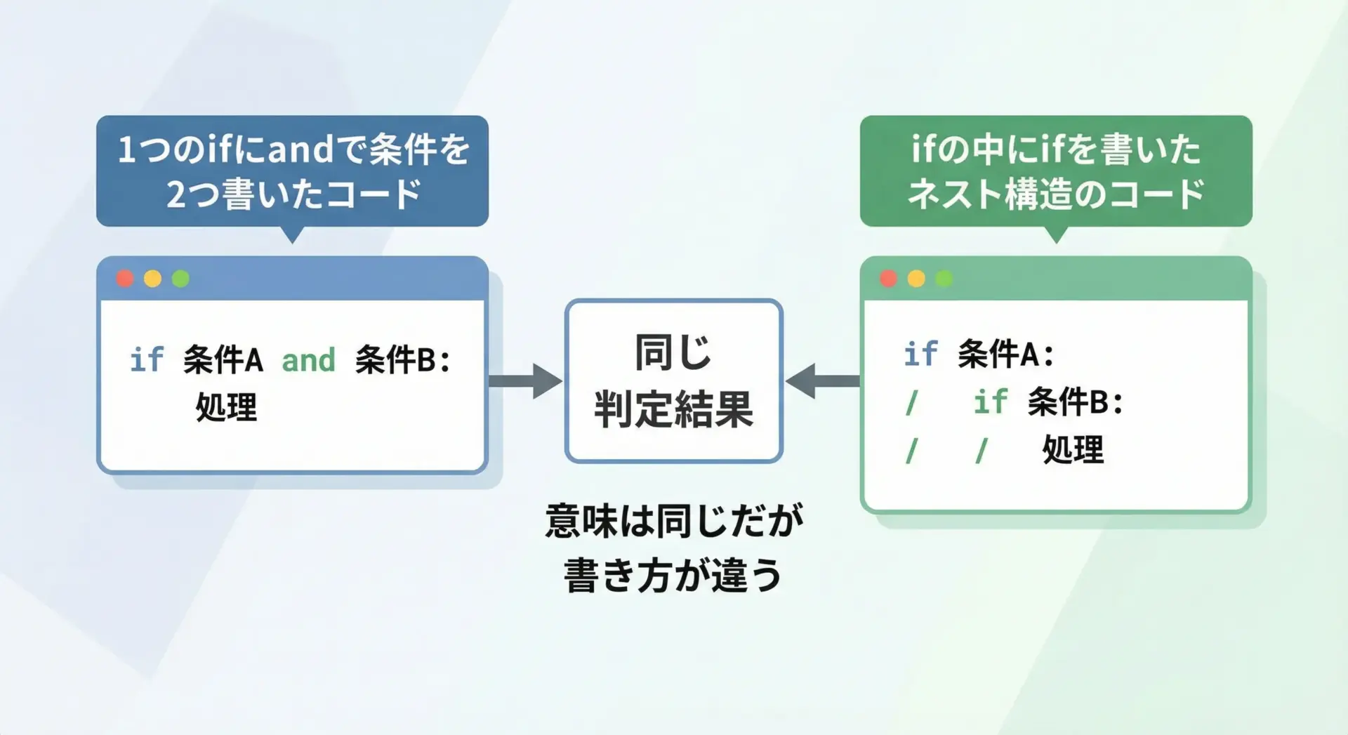 現実の条件に当てはめてみると、andのイメージが一気につかみやすくなります。