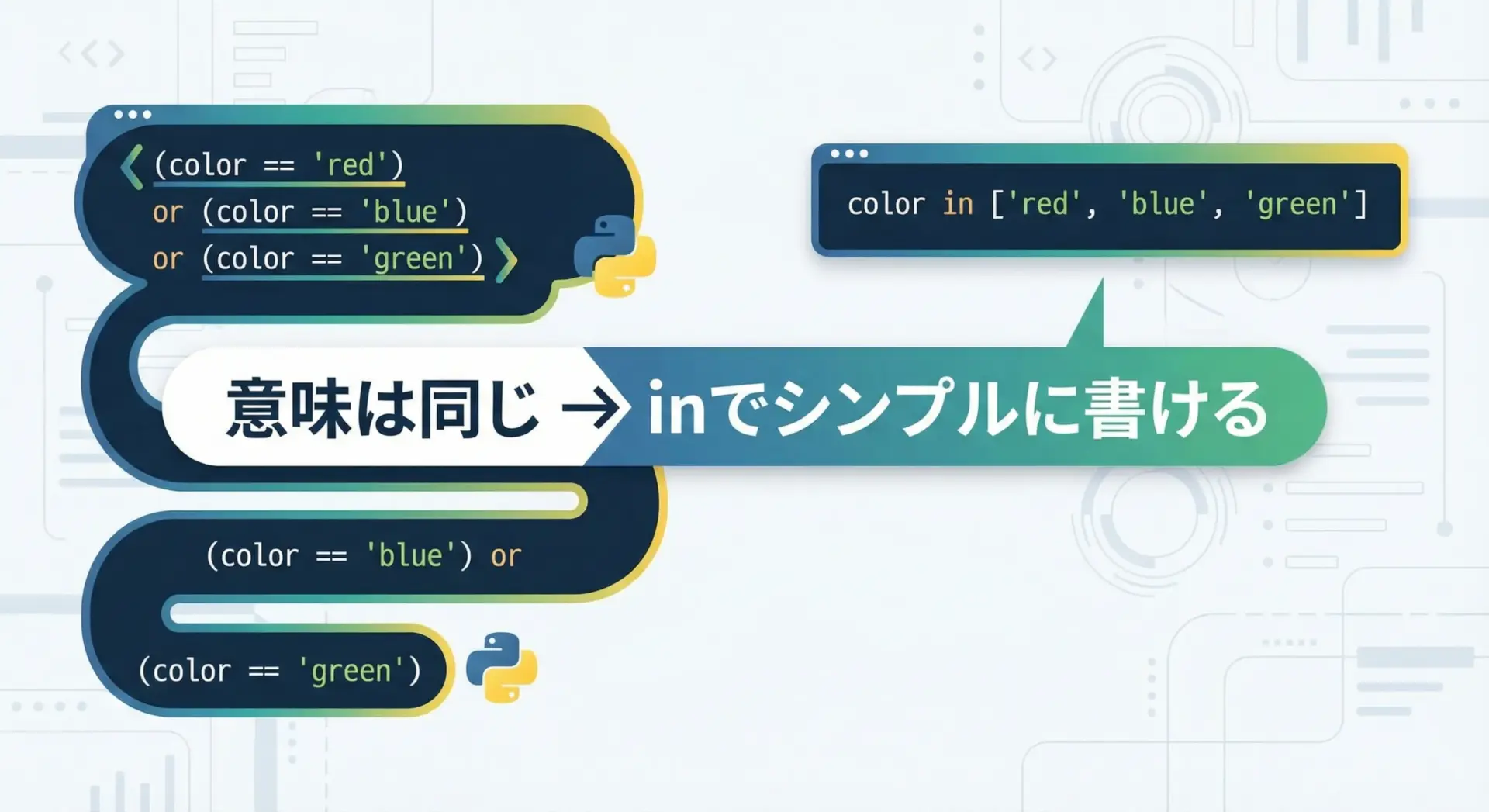 このような「式同士」の組み合わせはor、「候補の列挙」はinというイメージを持つと、きれいなコードを書きやすくなります。