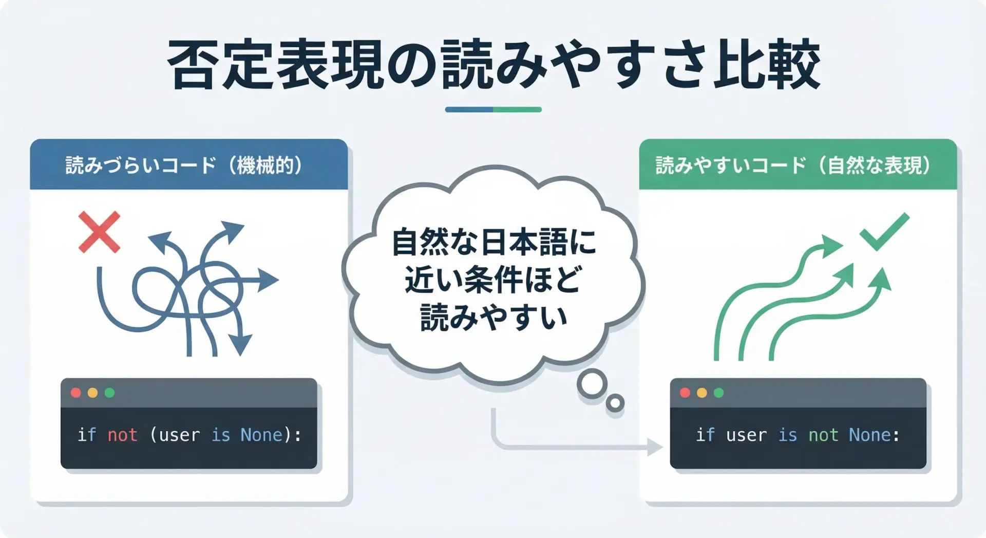 「notを使うより、比較演算子側を工夫したほうが読みやすい」ケースはよくあります。
