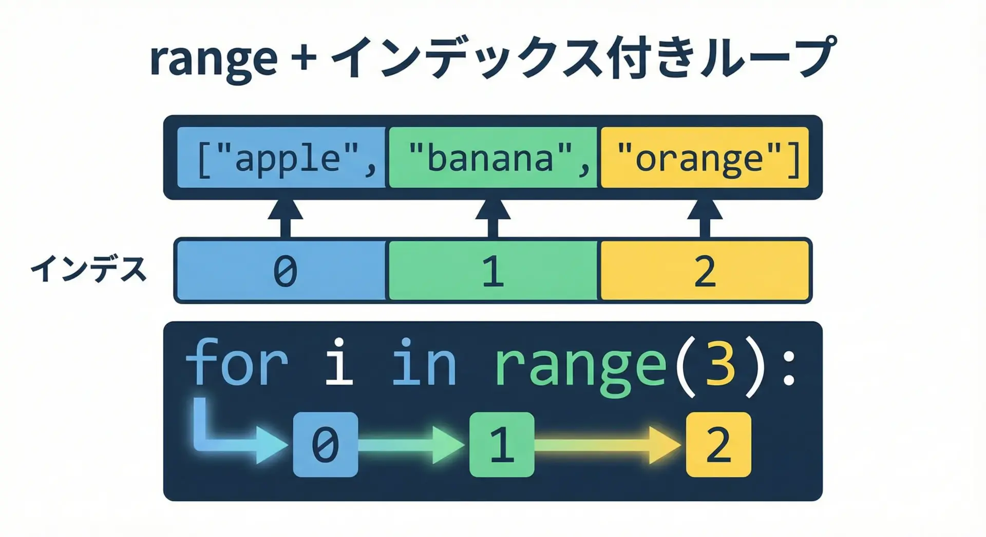 リストの「位置(インデックス)」を使って処理したい場合、rangeを使ったインデックス付きループがよく使われます。